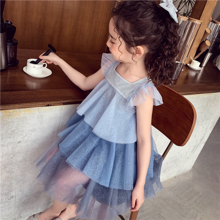 【送料無料】キッズドレス 子供 ドレス ワンピース ブルー 水色 ティアードスカート 膝上 膝丈 ミニスカート ワンピース 発表会 女の子 スクエアネック フレンチスリーブ 半袖 リボン 子ども 結婚式 披露宴 セミフォーマル カジュアル 元気 チュール シフォン ラメ キラキラ フリル 100 110 120 130 140 150 160 かわいい キュート パーティードレス ステージ 襟なし 子供服 ジュニア キッズ フラワーガール セレモニー 誕生日 個性的 存在感 おしゃれ 春 夏 kd0210