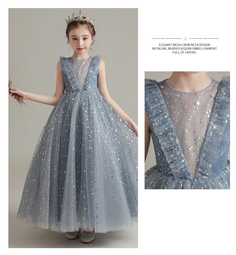 【送料無料】キッズドレス 子供 ドレス おしゃれ ブルー 青 グレー ニュアンスカラー キラキラ ラグジュアリー 大人っぽい ロングドレス ピアノ 発表会 女の子 ノースリーブ チュール レース 星 シルバー フリル 子ども 結婚式 フォーマル シフォン 100 110 120 130 140 150 160 かわいい パーティー プリンセス ステージ 撮影 華やか ジュニア キッズ フラワーガール コンクール セレモニー 誕生日 エレガント 綺麗 クール シンプル 安い 春 夏 秋 冬 kd0221