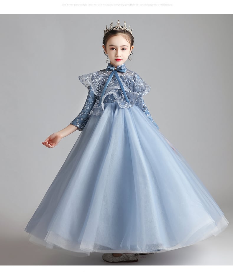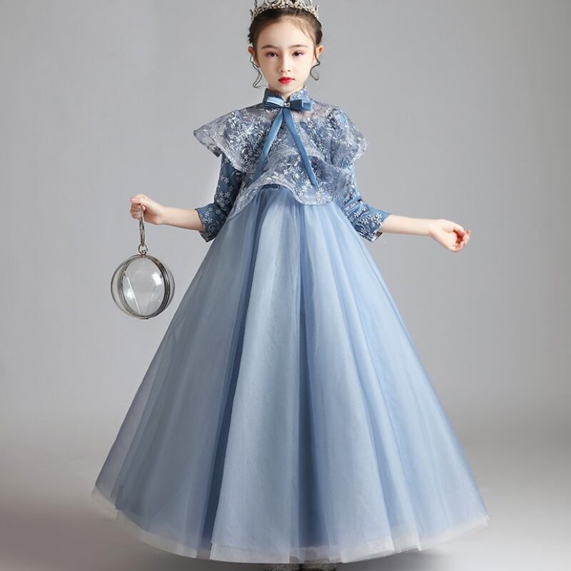 【送料無料】キッズドレス 子供 ドレス おしゃれ ブルー 青 ピンク レトロ クラシカル ドール 大人っぽい ロングドレス ピアノ 発表会 女の子 7分袖 チュール レース ケープ風 刺繍 フリル リボン スタンドカラー 子ども 結婚式 フォーマル シフォン 100 110 120 130 140 150 160 かわいい パーティー プリンセス ステージ 撮影 華やか ジュニア キッズ フラワーガール コンクール セレモニー 誕生日 エレガント ふんわり リュクス 高級感 春 夏 秋 冬 kd0217