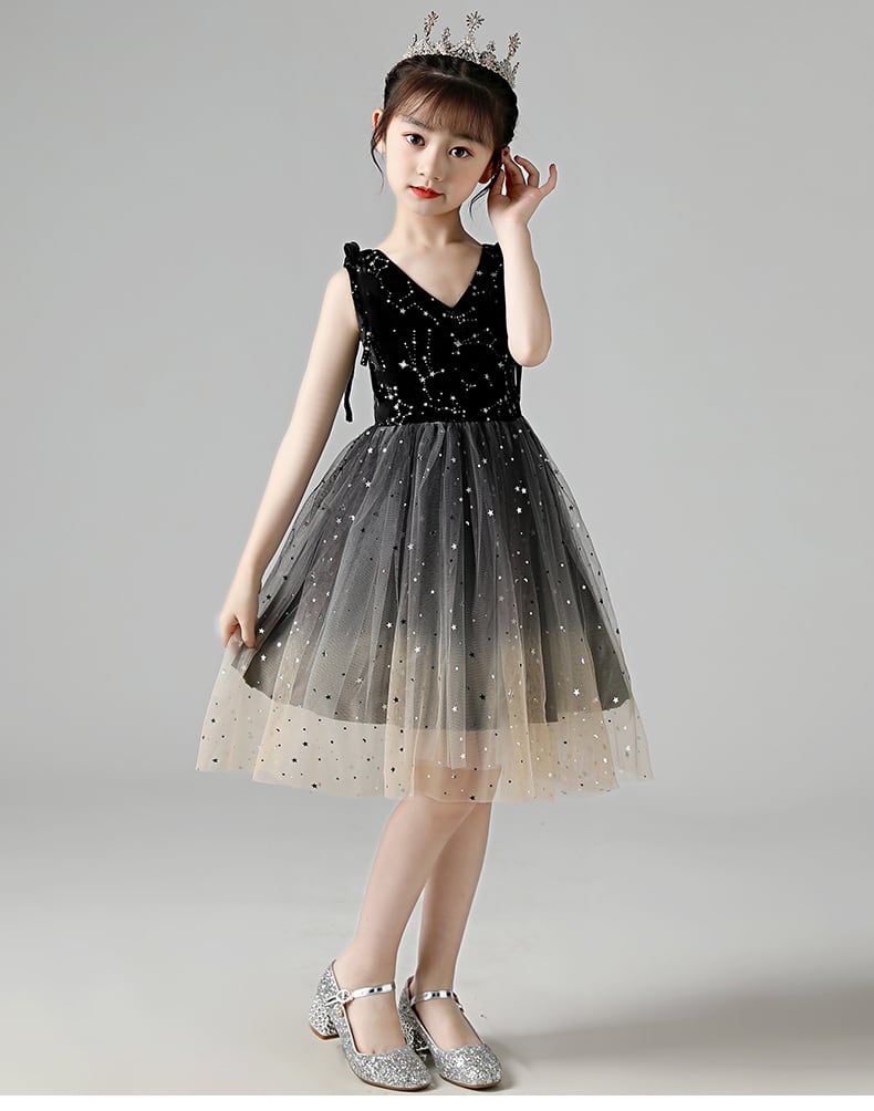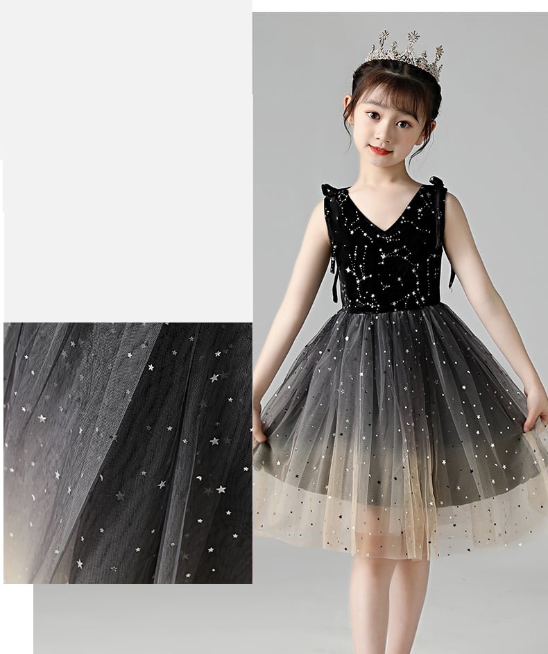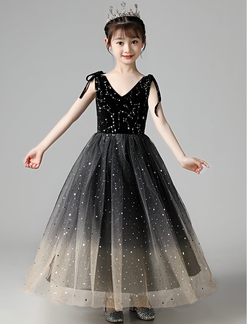 【送料無料】キッズドレス 子供 ドレス 黒 ブラック ベージュ バイカラー ロングドレス 膝上 膝丈 ダンス ピアノ 発表会 女の子 Vネック ノースリーブ リボン 子ども 結婚式 披露宴 セミフォーマル グラデーション チュール シフォン シースルー 星 キラキラ 120 130 140 150 160 かわいい 大人っぽい パーティードレス ステージ 襟なし 華やか シック ジュニア キッズ フラワーガール セレモニー 誕生日 個性的 存在感 おしゃれ お嬢様 春 夏 秋 高級感 新作 kd0205
