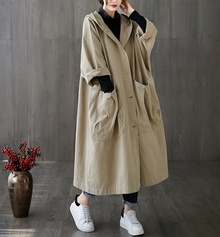 【送料無料】2色 アウター レディース ロングコート トレンチコート ロング丈 長袖 ラグランスリーブ フード付き ポケット付き コットン フリーサイズ 大きめ 薄手 オーバーサイズ ゆったり ルーズ パーカー 無地 秋 冬 大人可愛い こなれ感 ボーイッシュ おしゃれ 個性的 カジュアル コーデ ラフ カーキ ブラック 黒 ボタン 普段使い 休日 お出かけ レジャー 公園デビュー 10代 20代 30代 40代 学生 ママ 大人女子 韓国 ファッション 楽ちん db1703