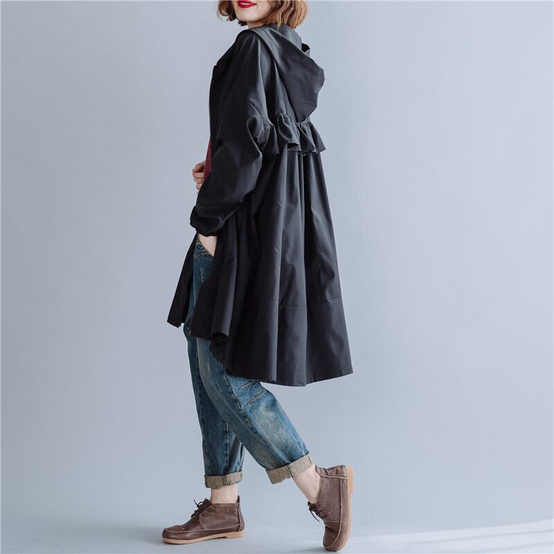 【送料無料】アウター ジャケット ブルゾン 黒 無地 おしゃれ ジャンパー ウインドブレーカー 春 秋 レディース ミディアム丈 長袖 フード付き バックシャン ルーズ ポケット ジッパー ジップ フリル シンプル カジュアル 大人可愛い 個性的 ボーイッシュ こなれ感 大人女子 抜け感 フリーサイズ ゆったり 大きめ 楽ちん 通勤 通学 学生 ママ お出かけ レジャー 休日 普段使い 楽ちん 10代 20代 30代 40代 ブラック 着回し 普段着 db1704