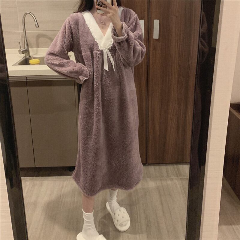 【送料無料】ルームウェア ガウン ワンピース もこもこ レディース ロング丈 長袖 Vネック レース リボン ふわふわ モコモコ フランネル 厚手 カジュアル かわいい おしゃれ キュート ラブリー ガーリー 大人可愛い ゆったり M L XL 無地 パープル 紫 コーラル 休日 部屋着 お泊り デート 女子会 旅行 リラックス お家 コーデ 韓国 ファッション あったか 暖かい 防寒 楽ちん モテ インスタ映え 10代 20代 30代 秋 冬 db1706