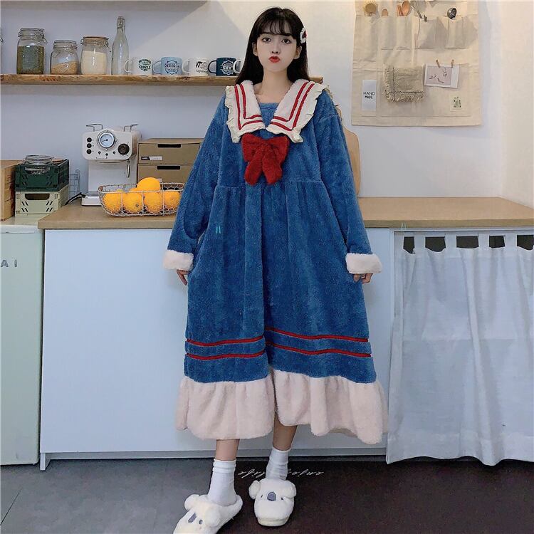 【送料無料】もこもこ ルームウェア パジャマ ワンピース 上下セット レディース ロング丈 長袖 襟付き リボン 個性的 制服風 モコモコ ふわふわ やわらか フレア かわいい おしゃれ 部屋着 寝巻き ホームウェア キュート ラブリー ユニーク ワンサイズ フリーサイズ ゆったり ブルー 青 春 秋 冬 10代 20代 お家 リラックス コーデ 寝間着 ナイトウェア お泊まり デート 女子会 旅行 あったか 暖かい 楽ちん セットアップ お揃い コーデ 韓国風 db1707