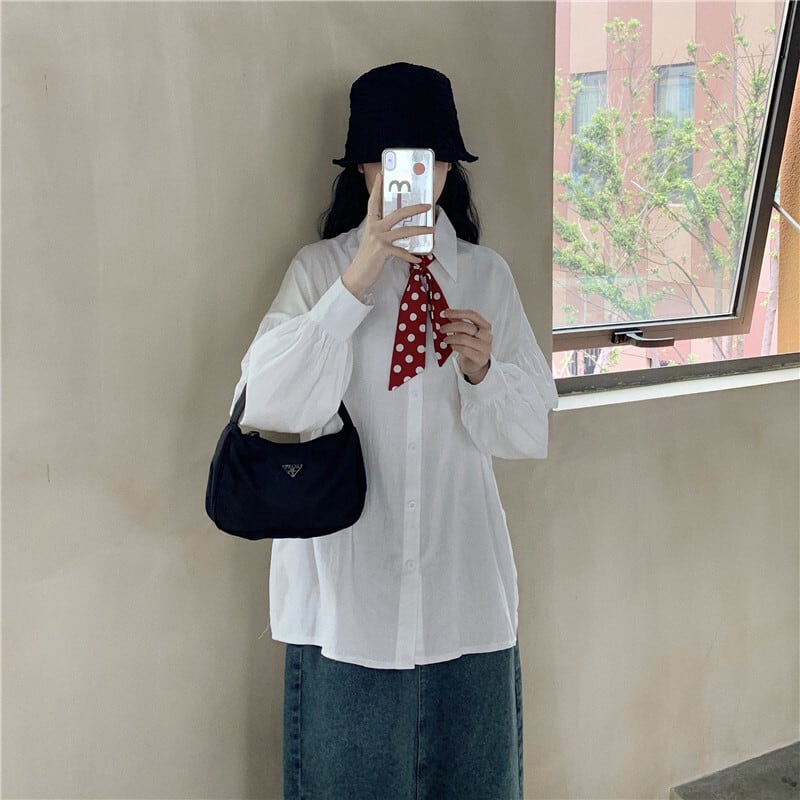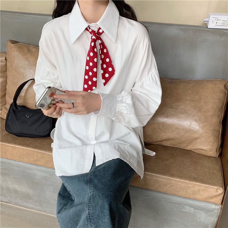 【送料無料】トップス シャツ レディース 長袖 ネクタイ付き 秋 ホワイト 白 無地 ドット柄 水玉 襟付き ボタン シンプル カジュアル レトロ かわいい 大人可愛い 大人女子 おしゃれ こなれ感 ワンサイズ フリーサイズ 10代 20代 通勤 通学 学生 デート お出かけ 休日 女子会 普段使い 着回し 重ね着 韓国 ファッション db1724
