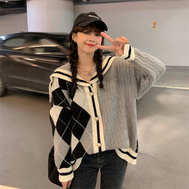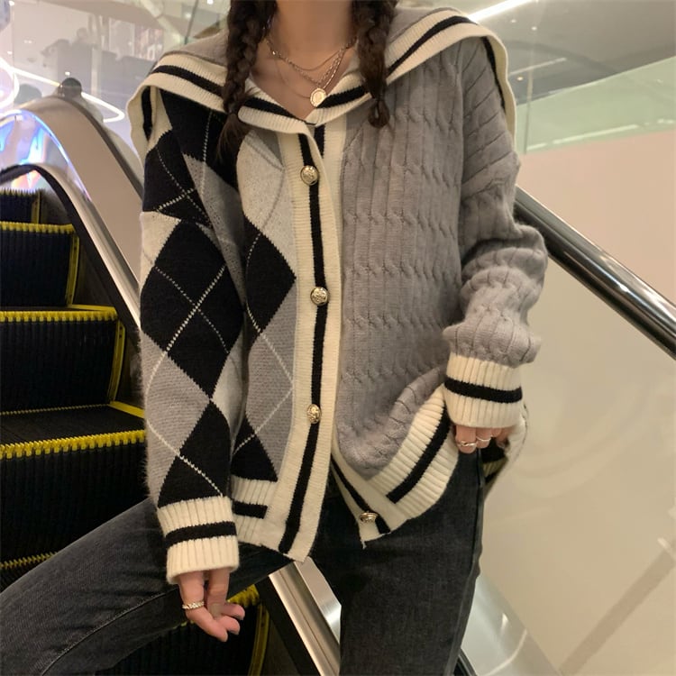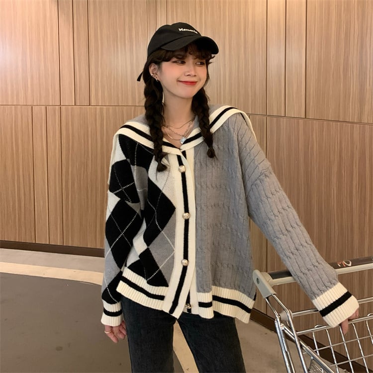 【送料無料】トップス ニット カーディガン レディース 春 秋 グレー 灰色 チェック柄 長袖 襟付き ボタン シングルブレスト アーガイル柄 無地 かわいい カジュアル 大人可愛い おしゃれ レトロ お洒落 こなれ感 ラフ ボーイッシュ クール ルーズ 個性的 ワンサイズ フリーサイズ 10代 20代 通学 学生 普段使い 休日 お出かけ デート 女子会 旅行 モテ コーデ 韓国系 ファッション 人気 インスタ映え 楽ちん あったか db1743