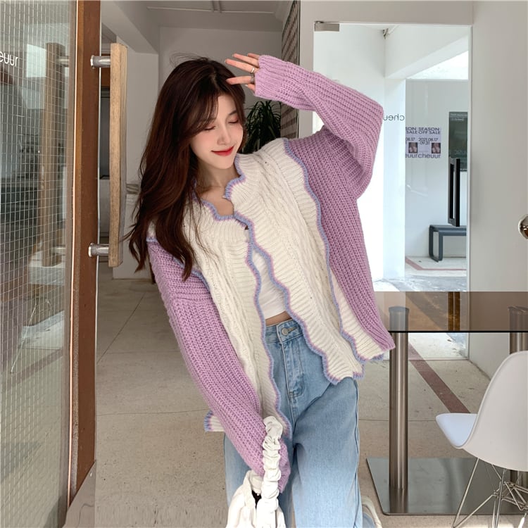 【送料無料】トップス ニット カーディガン レディース 春 秋 パープル 紫 長袖 ウェーブ かわいい カジュアル 大人可愛い お洒落 シンプル 個性的 ラブリー キュート 抜け感 こなれ感 ラフ おしゃれ 無地 10代 20代 学生 休日 お出かけ デート 女子会 旅行 普段使い モテ コーデ 韓国系 ファッション 人気 インスタ映え 楽ちん スタイル db1744