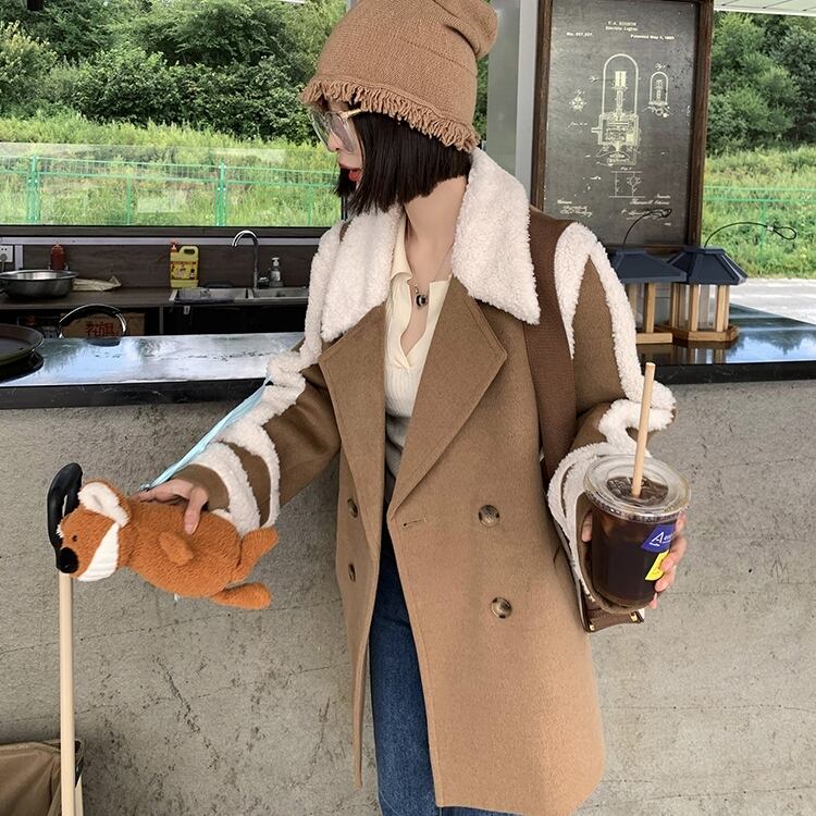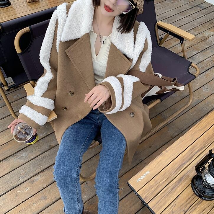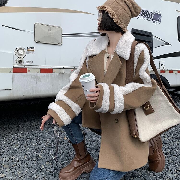 【送料無料】アウター コート レディース ボア ミディアム丈 秋 冬 キャメル バイカラー もこもこ ジャケット 襟付き ボタンダブルブレスト 長袖 カジュアル シンプル かわいい おしゃれ 大人可愛い こなれ感 大人女子 お洒落 XS S M L XL 10代 20代 30代 学生 OL ママ 通勤 通学 普段使い 休日 お出かけ 女子会 デート 旅行 韓国系 ファッション スタイル モテ コーデ インスタ映え ショートコート 上着 ジャンバー 切り替え 異素材 db2031
