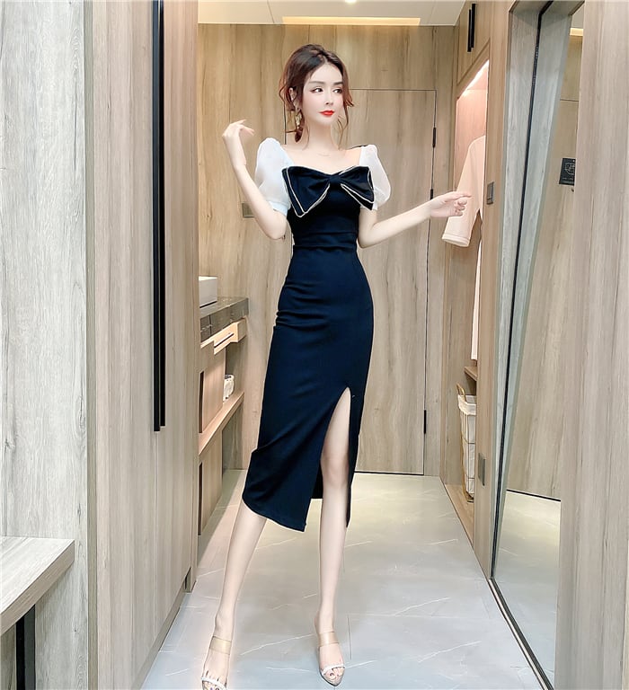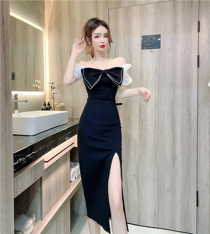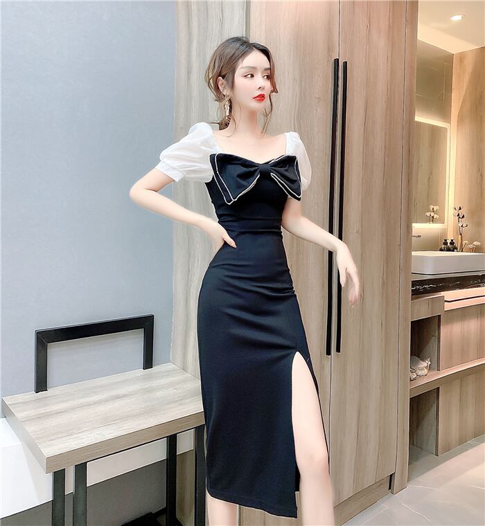 【送料無料】キャバ キャバ嬢 ワンピース パーティドレス キャバドレス レディース 黒 ブラック セクシー タイトワンピ リボン 大きいリボン きれいめ カッコイイ 大きいサイズ XL スリット サイドスリット ボディライン 色気 スリム チラ見せ おしゃれ 細身 大人 大人カワイイ クラブ 透け感 パーティー 可愛い ブラックドレス ナイトドレス 脚長 モテる モテコーデ かわいい 10代 20代 30代 韓国系 安い プチプラ no2054