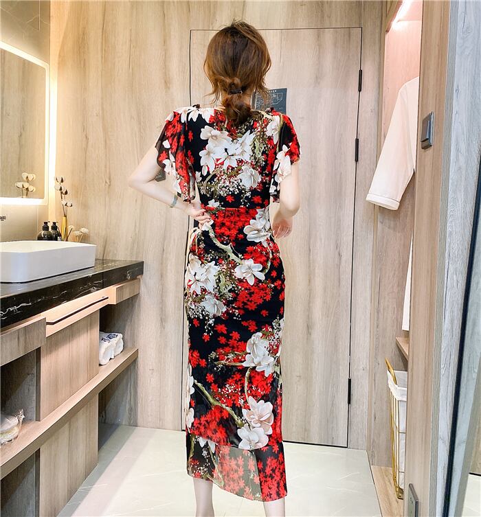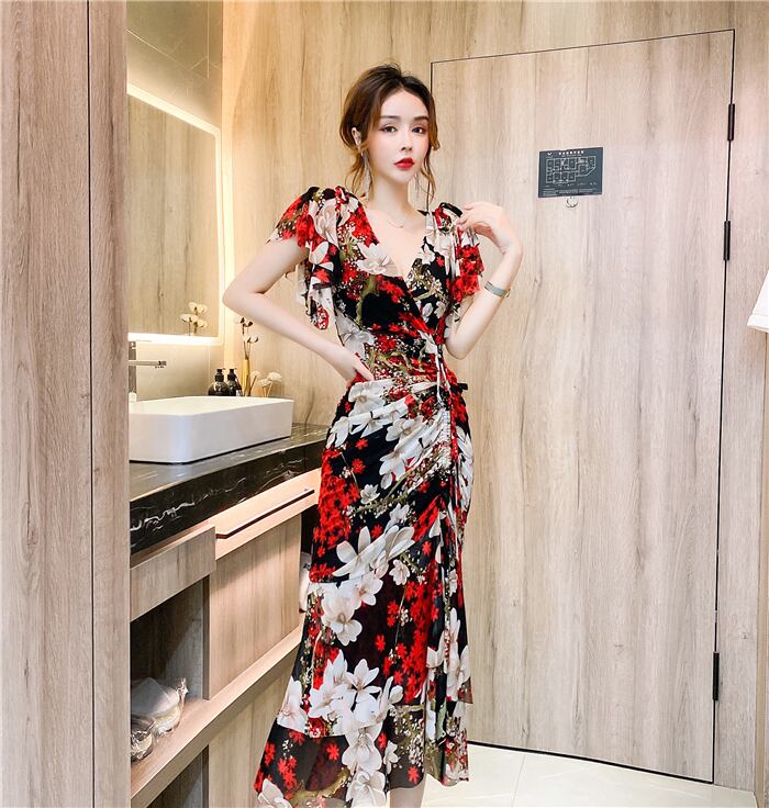 【送料無料】2色 ワンピース ドレス レディース カジュアル 花柄 きれいめ 個性的 キャバ ドレス ミモレ丈 膝下 半袖 Vネック カシュクール 赤 黄 レッド イエロー ボタニカル柄 袖あり パーティードレス 二次会 お呼ばれ 可愛い スリット 二の腕カバー フレア ギャザー イブニングドレス 大きいサイズ xl パーティ モテる モテコーデ デート服 デート きれいめ キレイ オシャレ 華やか 派手 柄 お姉さん 10代 20代 30代 40代 韓国系 プチプラ 安い no2074
