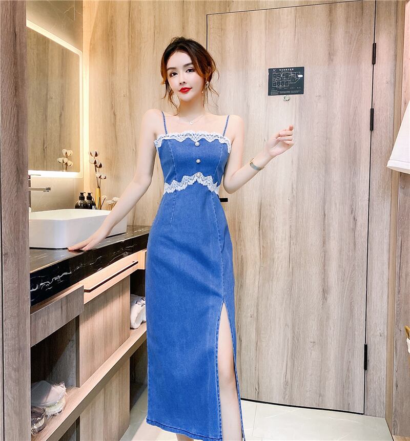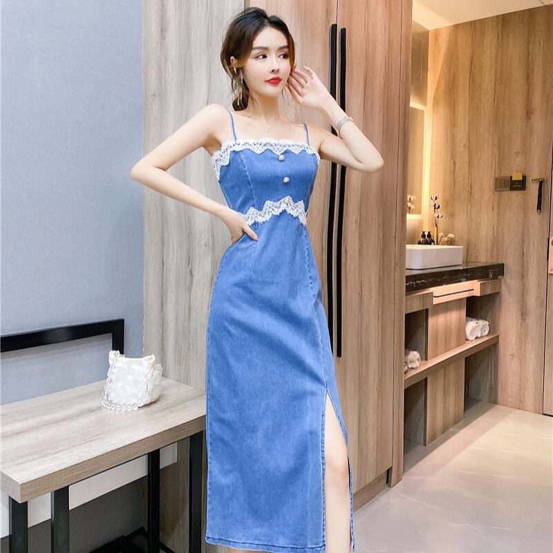【送料無料】デニム ワンピース ドレス レディース キャバ ドレス 膝下 ミモレ丈 レース スリット タイト キャミソール風 大人可愛い 個性的 カジュアル きれいめ ワンピ セクシー ブルー 青 露出 おしゃれ 可愛い キャバクラ 細身 色気 キャバ嬢 スリム いい女 ワンピドレス パーティドレス イブニングドレス レトロ ガーリー ラブリー Iライン スカート モテる モテコーデ かわいい 大人 キレイ 大きいサイズ xl 10代 20代韓国系 プチプラ 安い ファッション no2077
