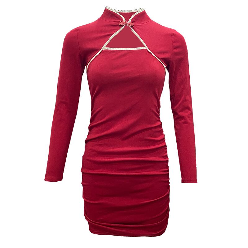 【送料無料】2色 キャバ ドレス チャイナドレス レディース 長袖 タイト ミニ ボディコン 大人可愛い 個性的 セクシー 胸元 ワンピ おしゃれ ミニドレス キャバ嬢 キュート ガーリー クール エレガント 谷間 魅せ 赤 黒 きれいめ キャバクラ パーティードレス ミニ ワンピース 無地 いい女 ハイウエスト 細身 シャーリング ブラック レッド シャーリング ワンピドレス クラブ 衣装 大人 パーティー 脚長 かわいい 10代 20代 30代 韓国系 安い プチプラ チャイナ風 no2130