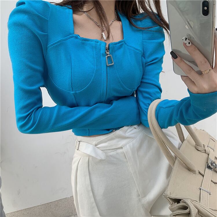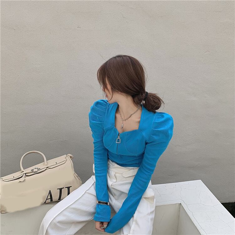 【送料無料】 2色 トップス レディース ジャケット 黒 青 ブラック ブルー ロンT 長袖 ジップアップ 無地 パフスリーブ ショート丈 大人可愛い レトロ セクシー かっこいい おしゃれ カジュアル こなれ感 インスタ映え 秋 冬 10代 20代 30代 通勤 学生 OL 女子会 休日 普段使い お揃い 双子 韓国 ファッション コーデ 人気 大人カジュアル クール シンプル マニッシュ トレンド db2099