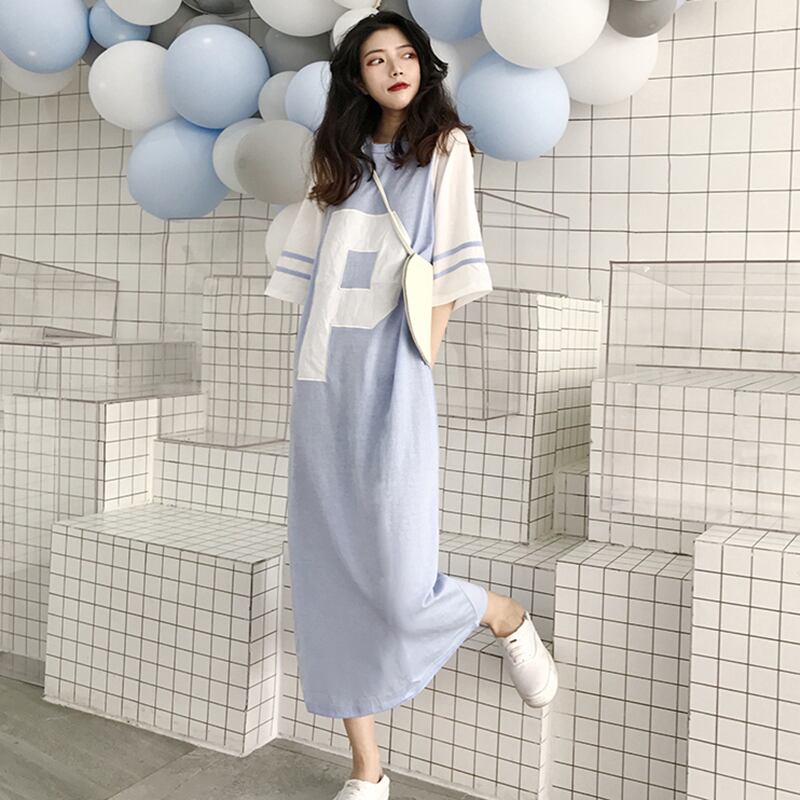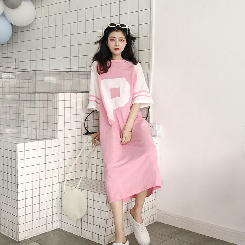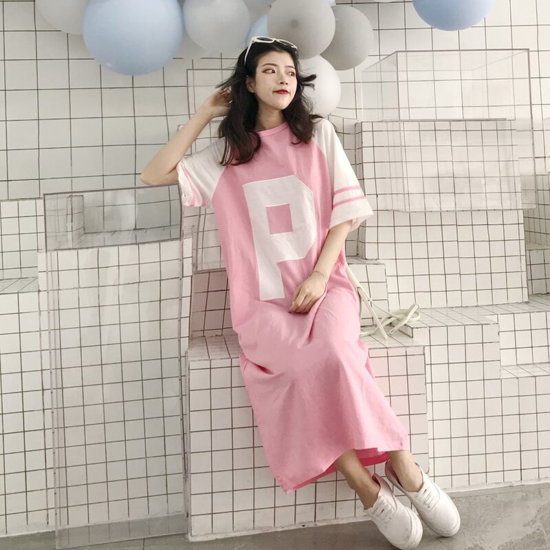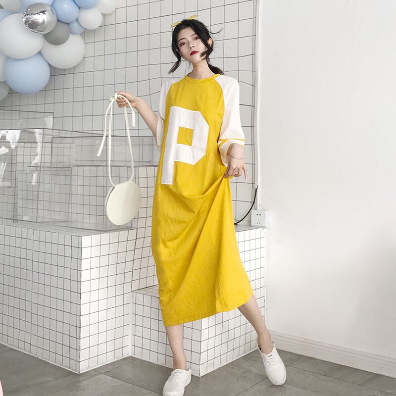 【送料無料】4色 ワンピース レディース Tシャツワンピ ロング ルーズ ラウンドネック 大きいサイズ 七分袖 おしゃれ ロゴ ラグランスリーブ 黒 青 ピンク 黄 ブラック ライトブルー イエロー カジュアル 可愛い オーバーサイズ 大きめ ゆったり こなれ感 S M L XL 2XL 3XL 4XL 5XL コーデ 通勤 学生 10代 20代 30代 春 夏 トレンド インスタ映え 韓国 ファッション お揃い 普段着 ママ 公園 女子会 着回し お洒落 存在感 主役級 ゆる かわいい db2123