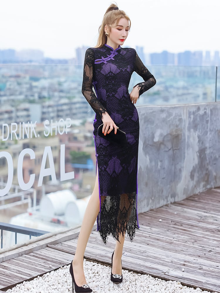 【送料無料】3色 チャイナドレス ロング キャバ ドレス 黒 紫 黄色 セクシー 大胆 スリット セクシー パーティードレス ワンピ おしゃれ ハイネック 総レース 透け感 Iライン スレンダー キャバ嬢 きれいめ かっこいい 大きいサイズ xl 個性的 キャバクラ ミモレ丈 いい女 細身 スリム ハイウエスト ワンピドレス 華やか ゴージャス ブラック イエロー ラウンジ クラブ 衣装 大人 可愛い イブニングドレス 脚長 モード系 10代 20代 30代 40代 韓国系 no2156