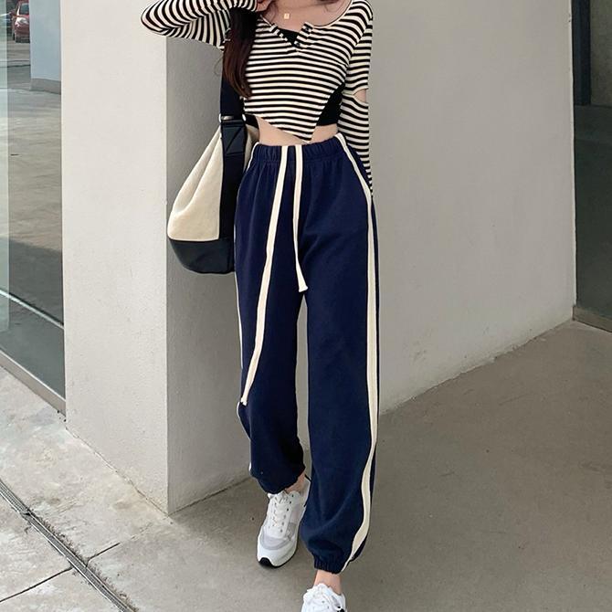 【送料無料】2色 スウェット ボトムス パンツ スポーツパンツ ズボン 春 秋 グレー 灰色 ダークブルー 青 無地 ハイウエスト ワイドレッグ ポケット ドローストリング ドローコード サイドライン ストレート ウエストゴム ルーズ シンプル カジュアル シンプル かわいい おしゃれ 大人可愛い こなれ感 ラフ 抜け感 S M L 10代 20代 30代 40代 休日 オフ リラックス お泊まり スポーツ ジム ヨガ 運動 トレーニング 韓国系 ファッション 楽ちん コーデ 普段使い db2171