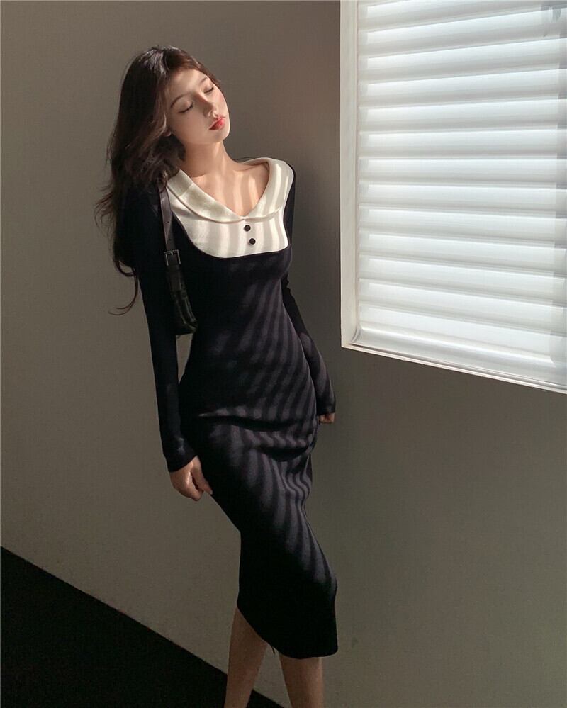 【送料無料】ワンピース ドレス レディース タイト 黒 セクシー ミディアム丈 膝丈 ミモレ丈 長袖 襟付き 秋 冬 ブラック ホワイト 黒 白 バイカラー モノトーン カジュアル レトロ キャバ ワンピ ドレス かわいい おしゃれ こなれ感 大人可愛い 大人カジュアル 大人女子 お洒落 きれいめ 上品 清楚 S M L 10代 20代 30代 40代 普段使い 普段着 デイリー 休日 お出かけ デート 女子会 インスタ映え 韓国 スタイル 韓国系 ファッション db2195
