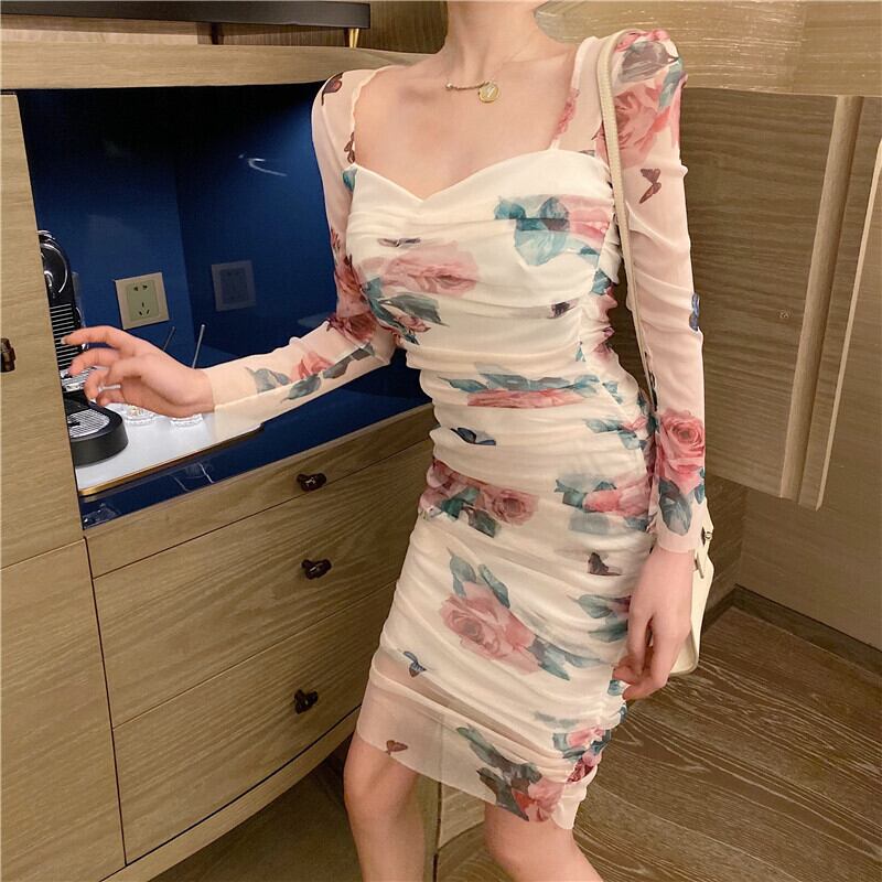 【送料無料】2色 ドレス ワンピース レディース 花柄 タイト 膝丈 ミニ 個性的 キレイめ 白 黒 パーティードレス キャバドレス フラワー バラ 薔薇 柄 長袖 透け感 セクシー スリム デコルテ 袖あり ホワイト ブラック S M L 10代 20代 結婚式 二次会 お呼ばれ イベント 衣装 かっこいい 女っぽい 色気 スクエアネック おしゃれ 韓国 ファッション 春 夏 秋 ワンピ トレンド 細身 美スタイル シースルー 人気 ユニーク 華やか 存在感 目立つ dress no2105