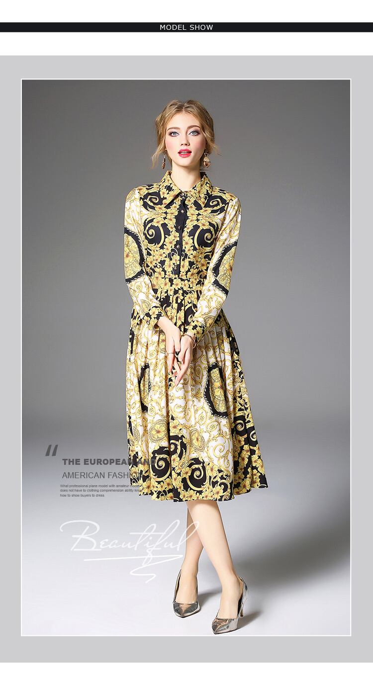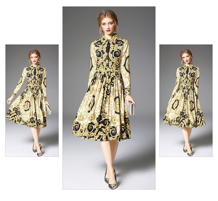 【送料無料】ワンピース 膝丈 ドレス レディース フレア 長袖 レトロ 個性的 エスニック 総柄 春 夏 秋 冬 大きいサイズ 2XL 黒 ゴールド カジュアル フォーマル パーティードレス ワンピドレス 結婚式 二次会 お呼ばれ シャツ風 シック 黄色 イエロー 黒 ブラック ヨーロピアン かっこいい お出かけ 演奏会 発表会 きれいめ 脚長 かわいい 可愛い 大人可愛い シャツワンピ dress ファッション トレンド 人気 10代 20代 30代 40代 韓国系 海外 安い プチプラ no2179