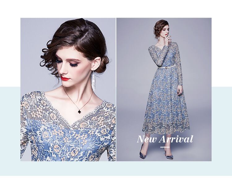 【送料無料】ワンピース ミモレ丈 ドレス 総レース パーティドレス ロング丈 花柄 レース 袖あり カジュアル フォーマル ワンピドレス Vネック Aライン 結婚式 二次会 お呼ばれ ブルー ウエストマーク 華やか 長袖 春 夏 秋 冬 大きいサイズ 2XL レディース 青 フラワー 存在感 エレガント フェミニン カッコイイ シック お出かけ 演奏会 発表会 かわいい 大人可愛い 上品 海外 モデル ファッション 人気 10代 20代 30代 40代 ニュアンスカラー 安い プチプラ no2186