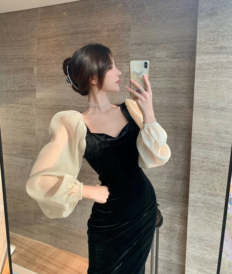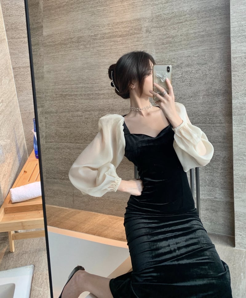 【送料無料】 ワンピース ワンピドレス キャバドレス ドレス レディース 長袖 ドッキング 切り替え 黒 パーティードレス バイカラー マーメイド ボリューム袖 パフスリーブ ブラック S M ゴージャス セクシー タイト キャバ 夜 上品 甘辛 キュート ガーリー かわいい 大人可愛い きれいめ 大人 おしゃれ レトロ 大人女子 個性的 主役級 存在感 女性用 お出かけ 女子会 パーティ 休日 韓国 韓国系 オルチャン ファッション 10代 20代 春 秋 冬 コーデ スタイル プチプラ db2207