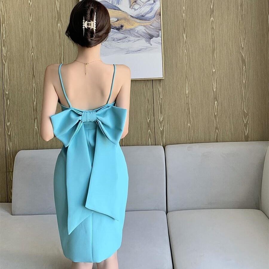 【送料無料】 キャバドレス ミニ ひざ丈 ワンピース ドレス レディース キャミ 肩出し バックコンシャン バックリボン リボン ブルー 青 水色 パーティードレス 無地 S M L ゴージャス ミニ丈 スリット セクシー タイト キャバ ギャル 夜 上品 甘辛 キュート かわいい 大人可愛い きれいめ 大人 シンプル おしゃれ お洒落 大人女子 個性的 主役級 存在感 女性用 学生 デート パーティ 韓国系 オルチャン ファッション 10代 20代 春 夏 コーデ スタイル プチプラ db2212