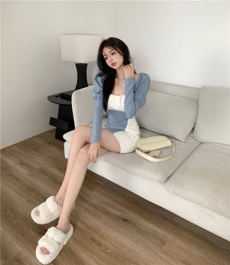 【送料無料 ワンピ ドレス キャバドレス ミニ タイト 個性的 バイカラー パフスリーブ 長袖 レディース 大人可愛い ワンピース パーティードレス 切り替え ボリューム袖 ブルー 青 ミニ丈 清楚 ボディコン セクシー 大人可愛い ガーリー キャバ 夜 上品 甘辛 キュート かわいい きれいめ 大人 シンプル おしゃれ お洒落 レトロ 大人女子 女性用 学生 デート お出かけ 女子会 パーティ 休日 韓国系 オルチャン ファッション 10代 20代 春 秋 冬 コーデ スタイル プチプラ db2228