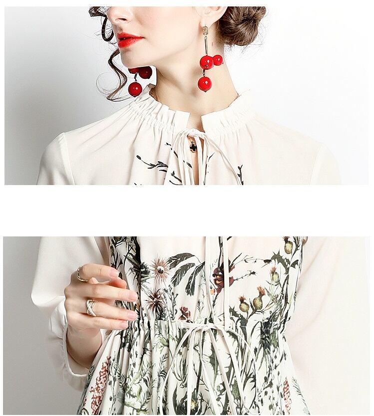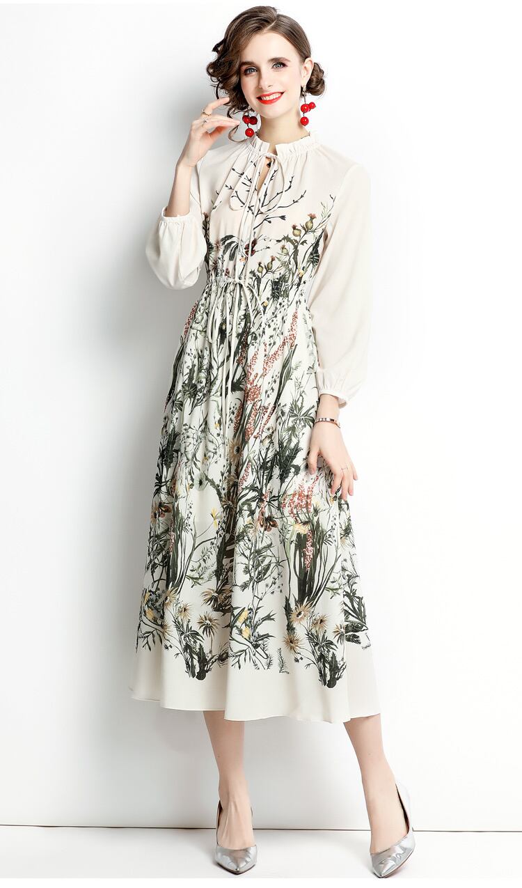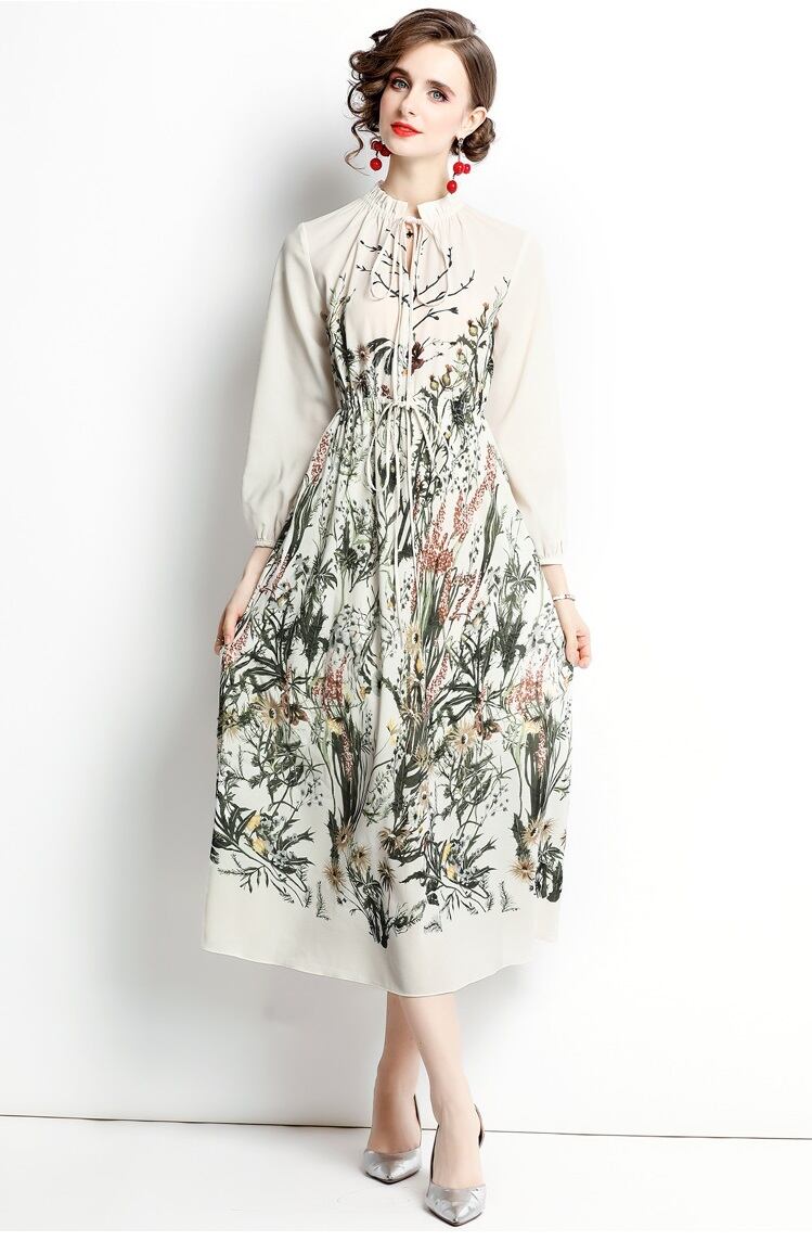 【送料無料】ワンピース ミモレ丈 花柄 ドレス パーティドレス 袖あり 結婚式 二次会 お呼ばれ ワンピドレス カジュアル ボタニカル柄 大人っぽい かっこいい 個性的 白 スタンドカラー リボン ウエストマーク フレア Aライン 華やか 長袖 春 夏 大きいサイズ 2XL レディース エアリー フェミニン 衣装 白 ホワイト 存在感 清楚 エレガント お出かけ 演奏会 発表会 かわいい キュート 大人可愛い デート 女子会 モテ ファッション 10代 20代 30代 40代 海外 安い no2189