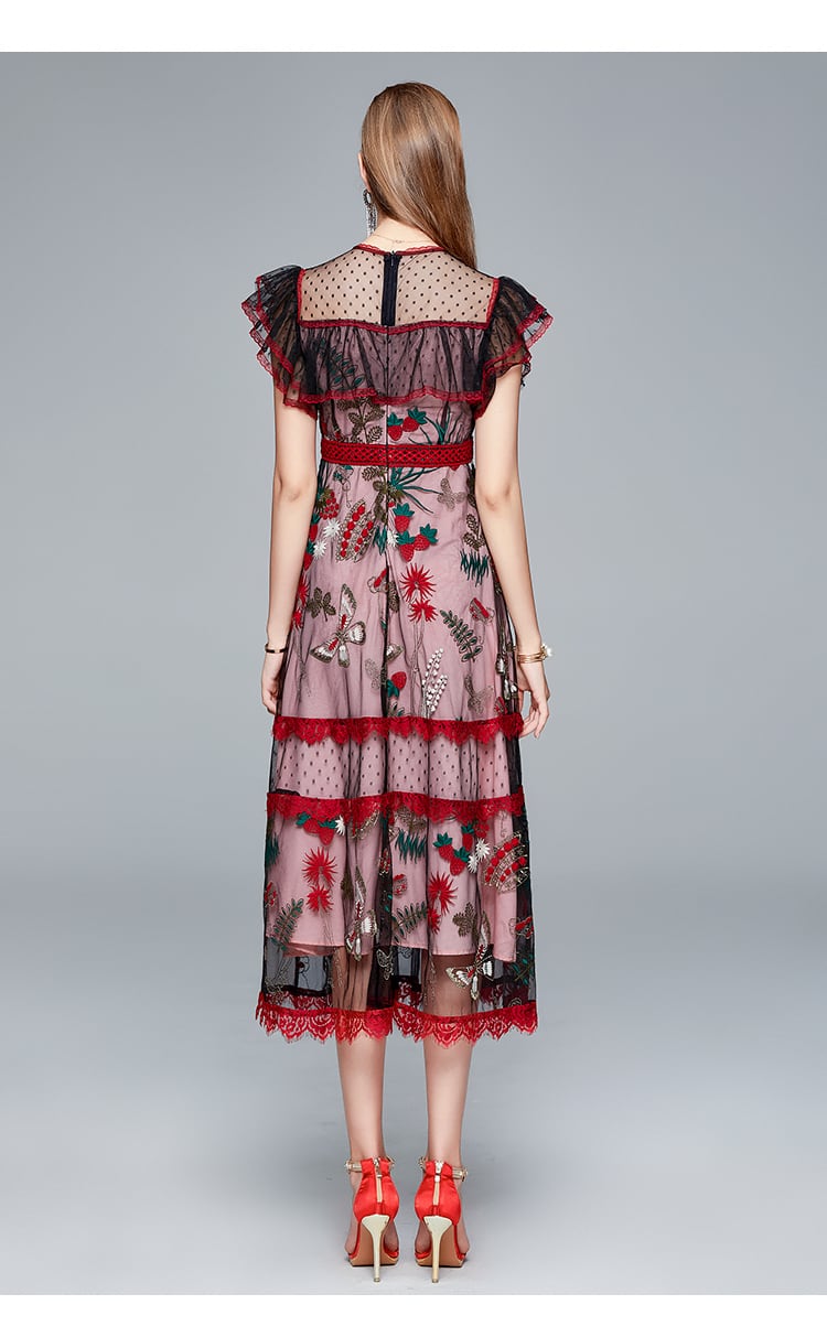 【送料無料】パーティードレス ミモレ丈 ロング ドレス 個性的 ピンク 花柄 いちご ドット柄 フリル レース ラブリー ガーリー かわいい ワンピース フォーマル 結婚式 二次会 お呼ばれ 衣装 スクエアネック Aライン 透け感 シースルー ウエストマーク 華やか 半袖 春 夏 大きいサイズ 2XL レディース プ主役級 存在感 フェミニン 演奏会 発表会 キュート 大人可愛い 袖あり インスタ映え 派手 海外 ファッション トレンド 人気 10代 20代 30代 安い プチプラ no2195