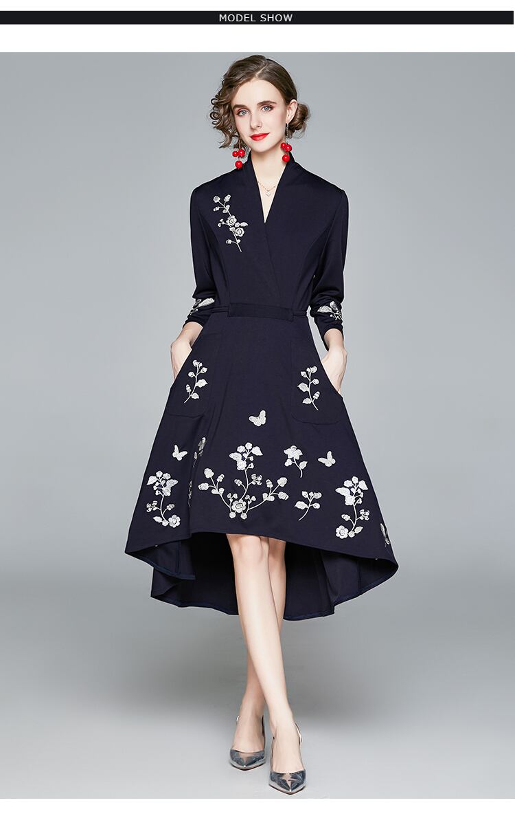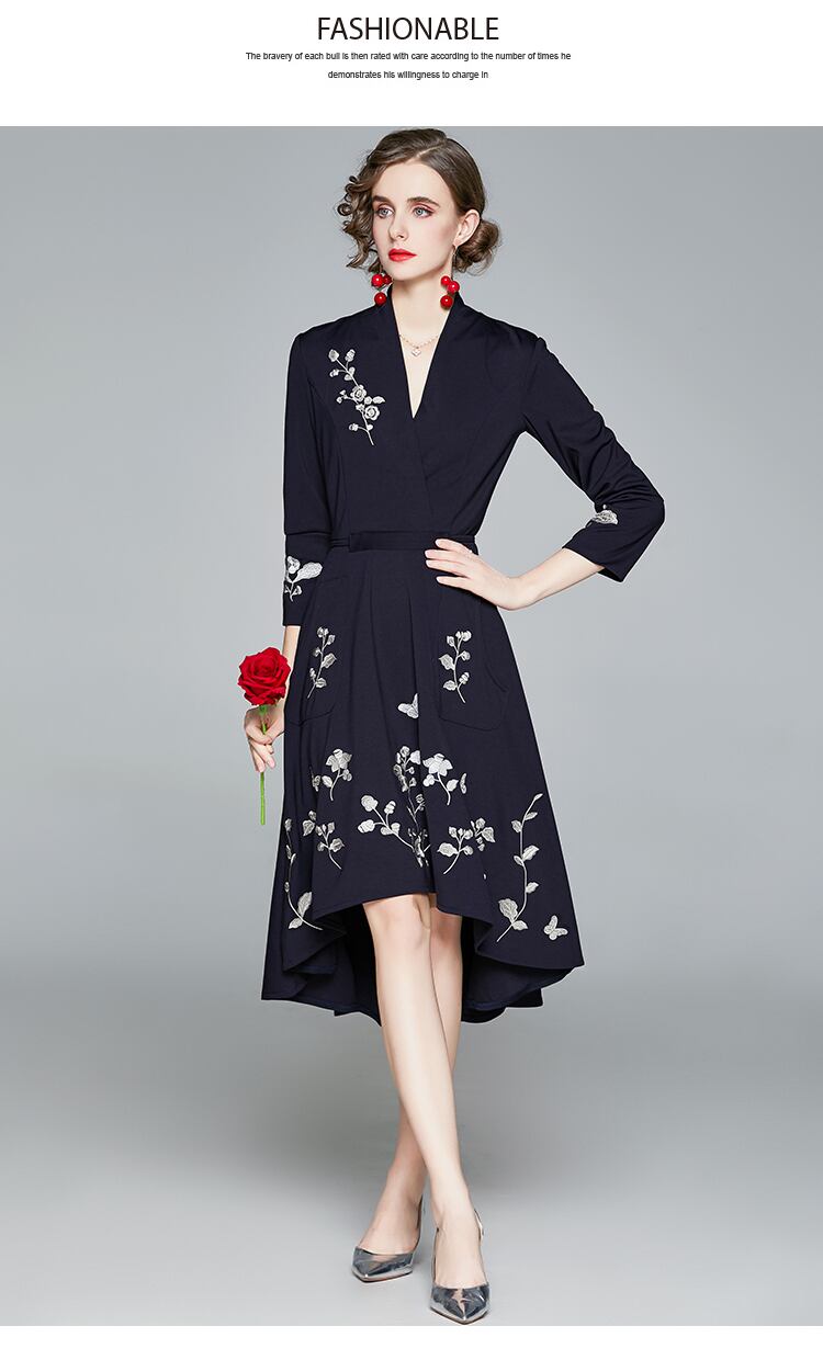 【送料無料】ワンピース ドレス 膝丈 パーティドレス ミモレ丈 フィッシュテール 袖あり ネイビー 花柄 刺繍 シック カッコイイ 個性的 フォーマル ワンピドレス 結婚式 二次会 お呼ばれ パーティ Vネック フレア 華やか 七分袖 春 秋 冬 大きいサイズ 2XL レディース 紺 セレブ 上品 主役級 存在感 エレガント フェミニン お出かけ 演奏会 発表会 大人可愛い お洒落 海外 ファッション トレンド 人気 10代 20代 30代 40代 ママ レトロ 安い プチプラ no2202