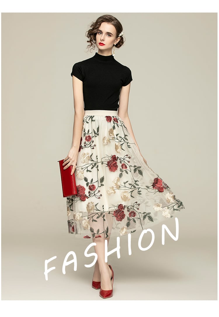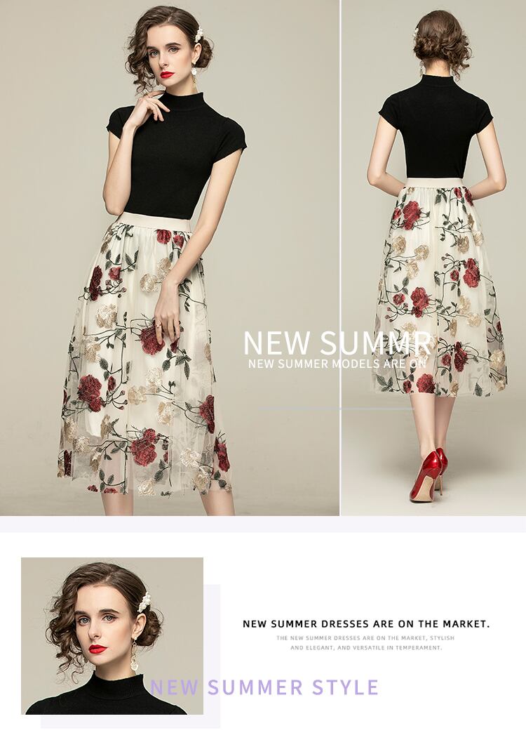 【送料無料】セットアップ レディース ニット スカート 上下セット 花柄 黒 モノトーン レトロ ガーリー 個性的 大人かわいい 2点セット トップス 半袖 ミモレ丈スカート フレア 花柄 刺繍 ベージュ チュール 透け感 パーティドレス シック 春 夏 秋 大きいサイズ 2XL バイカラー きれいめ セレブ 上品 存在感 清楚 エレガント フェミニン お出かけ 演奏会 発表会 結婚式 二次会 デート 女子会 海外 お洒落 ファッション 10代 20代 30代 40代 no2204