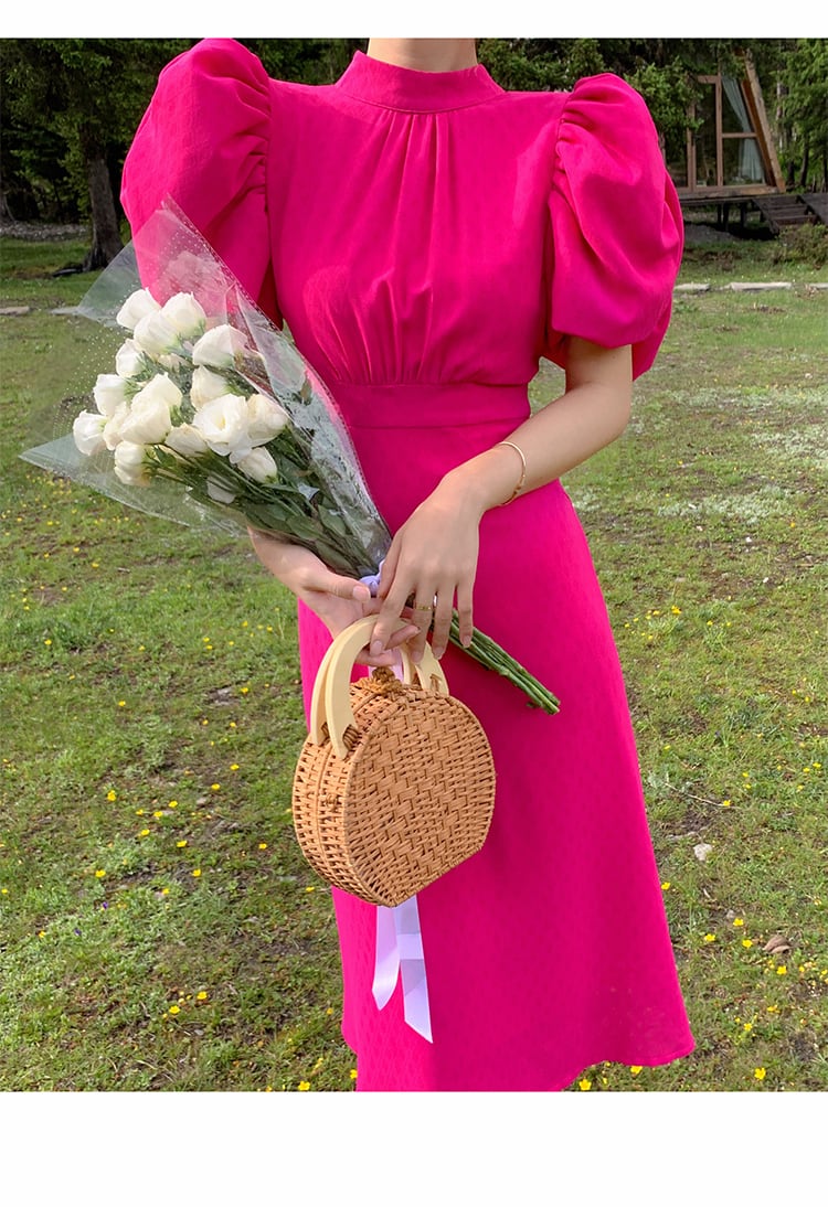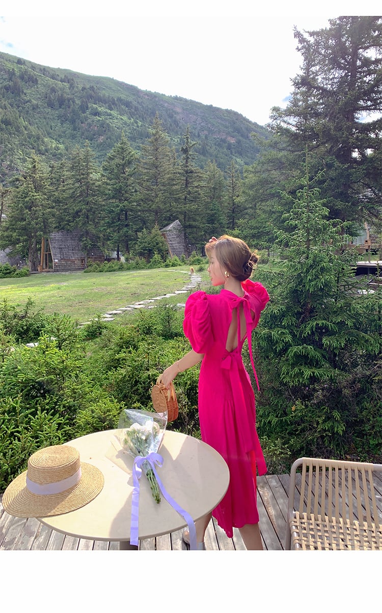 【送料無料】ドレス ワンピース ミモレ丈 ショッキングピンク パフスリーブ バックシャン 背中見せ 春 夏 ワンピドレス 半袖 リボン ボリューム袖 レディース 無地 きれいめ 華やか 大人可愛い ピンク ウエストマーク 大きいサイズ L 可愛い パーティードレス 女の子 スプリング サマー デート お出かけ 存在感 こなれ感 女子会 パーティ 普段使い デイリー使い 休日 主役級 インスタグラマー インスタ映え 韓国ファッション 海外 トレンド 人気 10代 20代 30代 40代 db2309