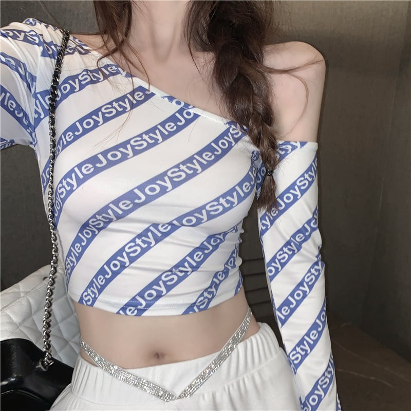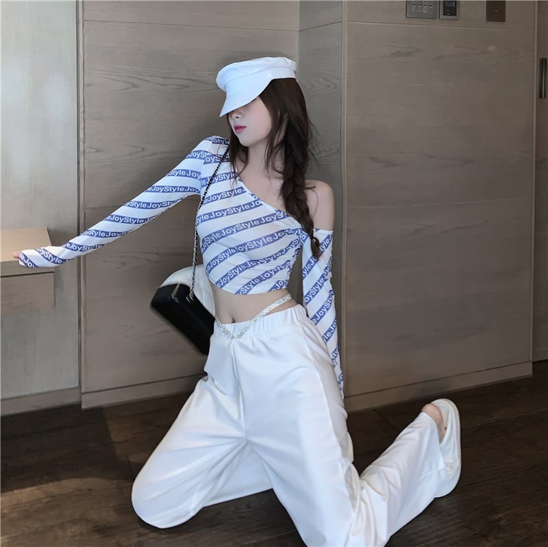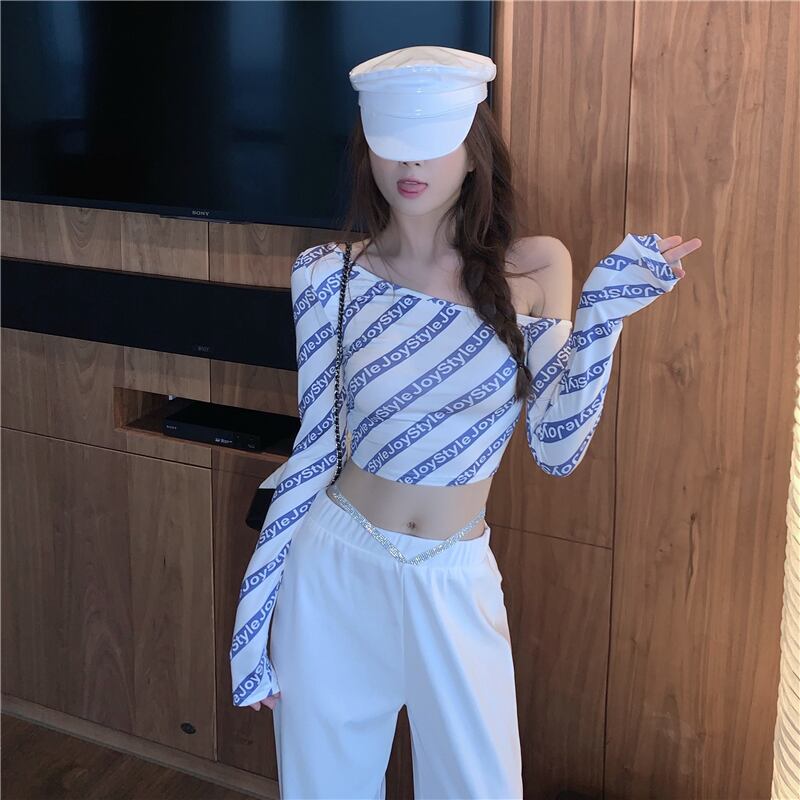 【送料無料】 カットソー オフショルダー トップス レディース 長袖 ショート丈 ストライプ へそ出し ミニ Tシャツ 可愛い 大人可愛い かっこいい ロゴ 英文字 ボーダー 白 青 ホワイト ブルー ガーリー こなれ感 S M L タイト フィット ダンス 衣装 インスタ映え 10代 20代 学生 女子会 休日 クラブ 普段使い お揃い 双子 韓国 ファッション コーデ 人気 大人カジュアル クール シンプル かわいい セクシー 大胆 キュート 主役級 存在感 トレンド db2259