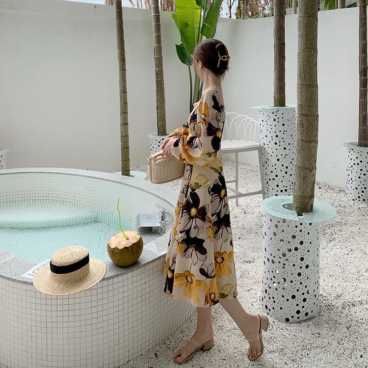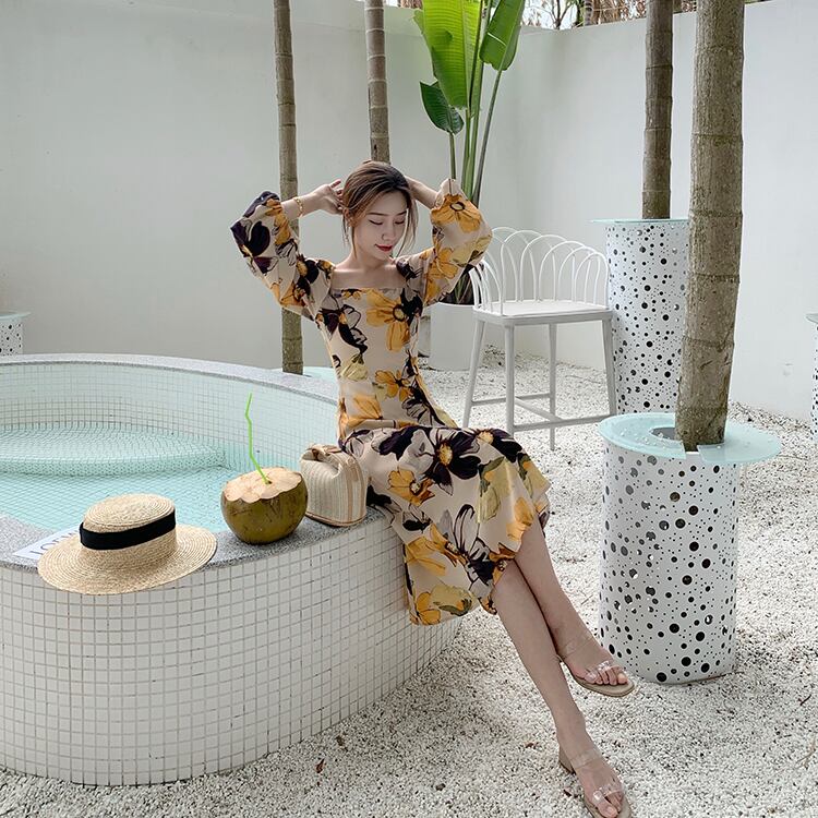 【送料無料】 ワンピース ドレス ひざ丈 花柄 個性的 カジュアル パーティードレス レディース ベージュ スクエアカラー Aライン ミドル丈 長袖 レトロ セクシー セレブ カッコイイ 清楚 フェミニン 華やか きれいめ 結婚式 二次会 お呼ばれ フォーマル ドレス 大人可愛い ミモレ 袖あり おしゃれ こなれ感 S M L XL 脚長 インスタ映え 春 夏 秋 10代 20代 30代 韓国 ファッション コーデ 人気 クール リゾート パーティー クラブ いい女 存在感 主役級 db2278
