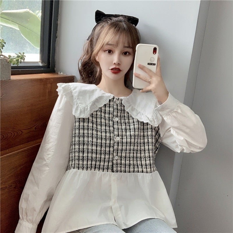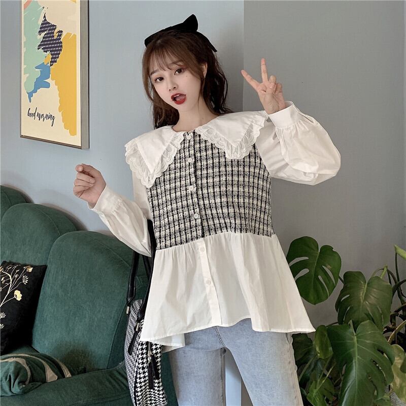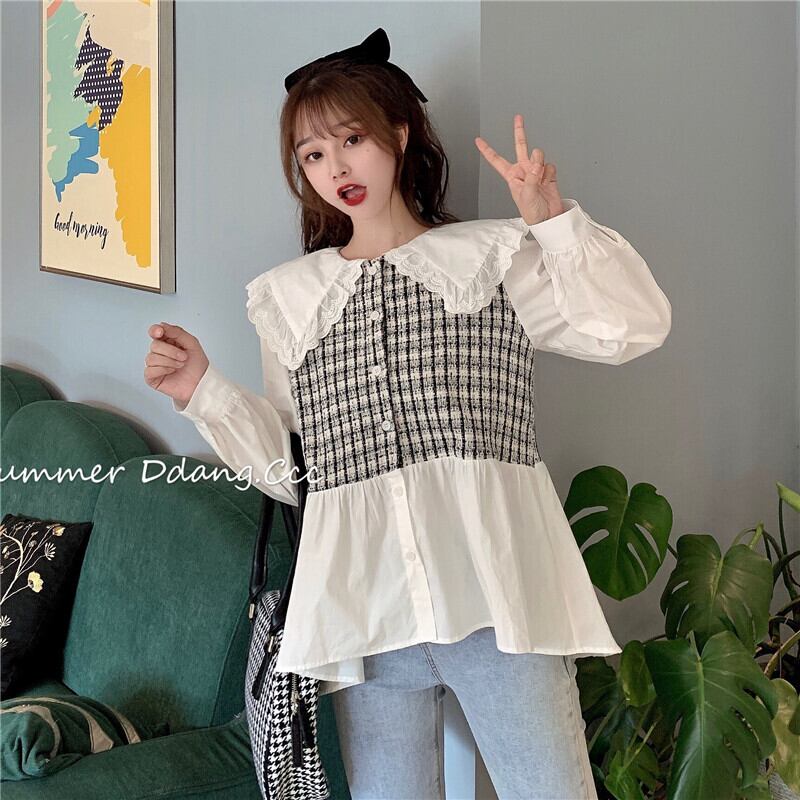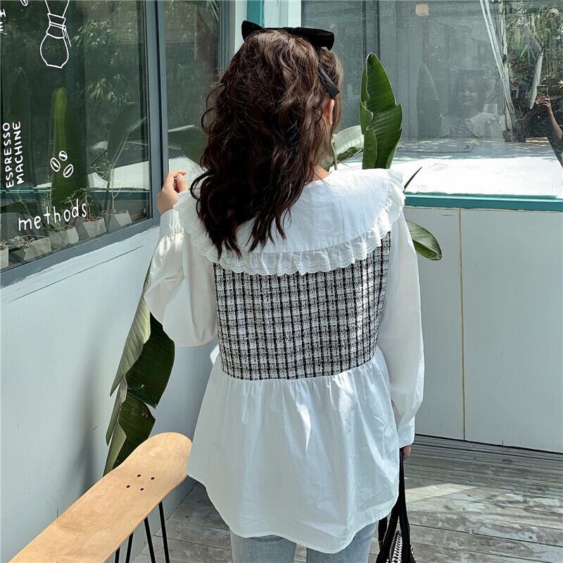 【送料無料】白 ブラウス シャツ レディース ビッグカラー 襟付き チェック柄 綿 異素材MIX 切り替えデザイン 春 秋 トップス 長袖 袖あり きれいめ カジュアル 大人可愛い キュート ラブリー 個性的 目立つ 他にない カジュアル コーデ ホワイト 白 春 秋 冬 セレブ カワイイ おしゃれ デート お出かけ 存在感 こなれ感 抜け感 ユニーク ファッション インスタ映え 韓国 オルチャン 海外 人気 アイテム 白シャツ 白ブラウス 格子柄 他にない 面白い 10代 20代 30代 db2443