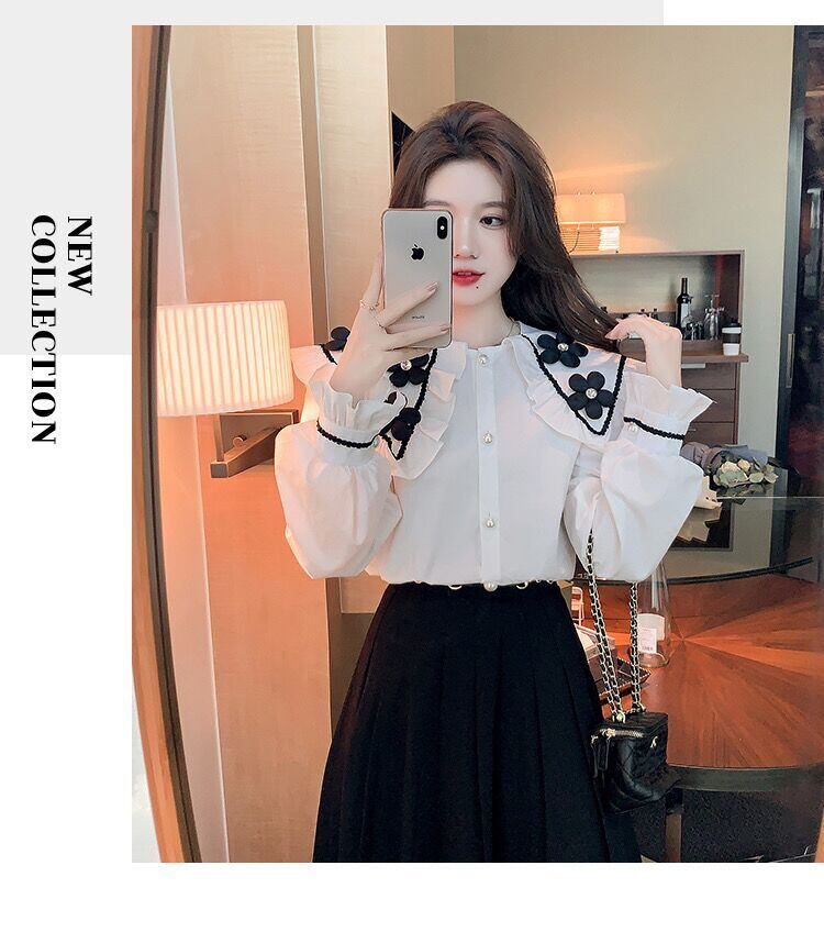 【送料無料】 トップス シャツ ブラウス レディース 長袖 白 ホワイト 黒 ブラック モノトーン モノクロ 無地 襟付き ビッグカラー 花 ぷっくり 立体 モノトーン 大人カラー シンプル クール かっこいい かわいい おしゃれ 大人女子 こなれ感 お洒落 大人可愛い ガーリー フリル 個性的 存在感 S M L 10代 20代 休日 お出かけ デート 女子会 韓国 ファッション コーデ インスタ映え 人気 トレンド 抜け感 レトロ 主役級 オシャレ ルーズ デザイン 可愛い db2465