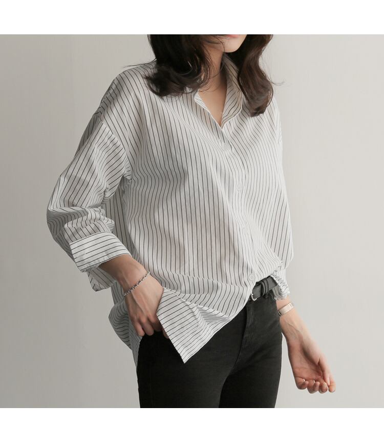 【送料無料】2色 シャツ ブラウス ストライプ シンプル ラフ ゆったり カジュアル 大人可愛い クール クール系 通勤 トップス 上品 長袖 レディース かっこいい ネイビー ホワイト 紺 白 春 夏 スプリング サマー 大きいサイズ XL 2XL セレブ カワイイ おしゃれ デート お出かけ 存在感 こなれ感 抜け感 女子会 普段使い デイリー使い 休日 主役級 インスタグラマー インスタ映え 韓国ファッション 海外 大人気 高見え トレンド 10代 20代 30代 40代 プチプラ db2512