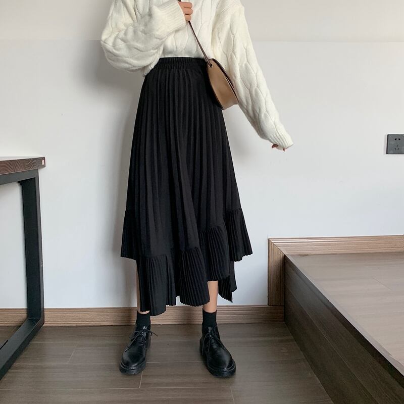 【送料無料】3色 ロングスカート レディース プリーツ フリル 春 秋 無地 ブラック 黒 アプリコット グレー 灰色 Aライン ハイウエスト スカート ボトムス アシンメトリー カジュアル ロング丈 かわいい おしゃれ 大人女子 こなれ感 お洒落 レトロ 大人可愛い シンプル 10代 20代 30代 40代 通勤 普段使い 普段着 デイリー お出かけ 休日 デート 女子会 体型カバー コーデ スタイル 韓国系 ファッション 着回し 韓国 db2349