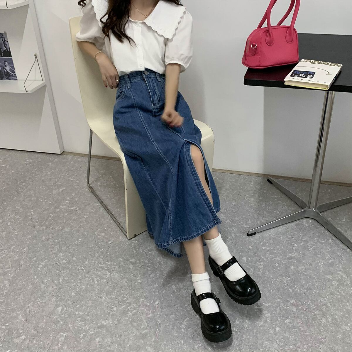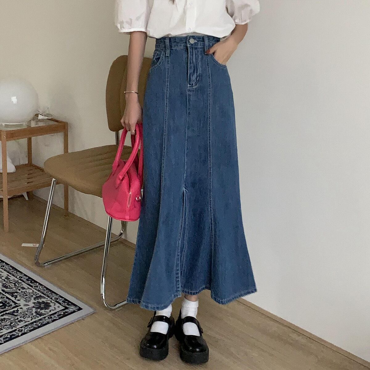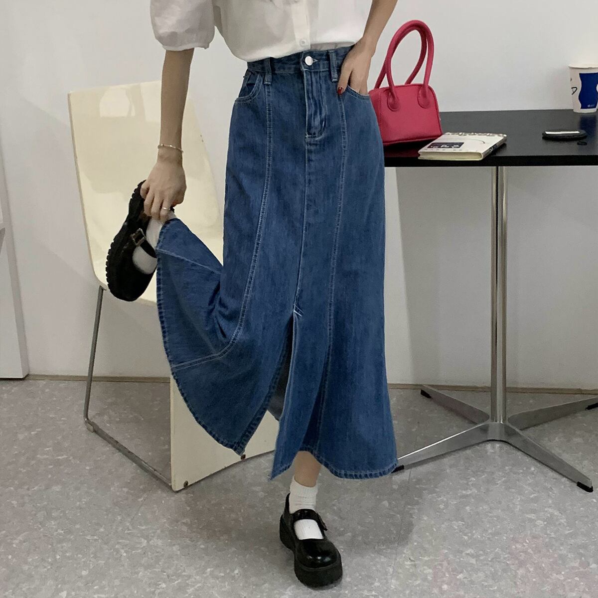 【送料無料】スカート レディース デニム チューリップ フィッシュテール デニムスカート ミモレ丈 スリット カジュアル レトロ おしゃれ ハイウエスト 大人可愛い 膝下 ひざ下 個性的 大きいサイズ ボタン 襟なし カジュアル 青 水色 ブルー 大人かわいい こなれ感 インスタ映え ロングスカート Iライン Aライン 大人カジュアル コーデ デート 通学 学生 休日 公園デビュー 主役級 10代 20代 30代 春 夏 トレンド 抜け感 オシャレ スリム S M L XL db2700