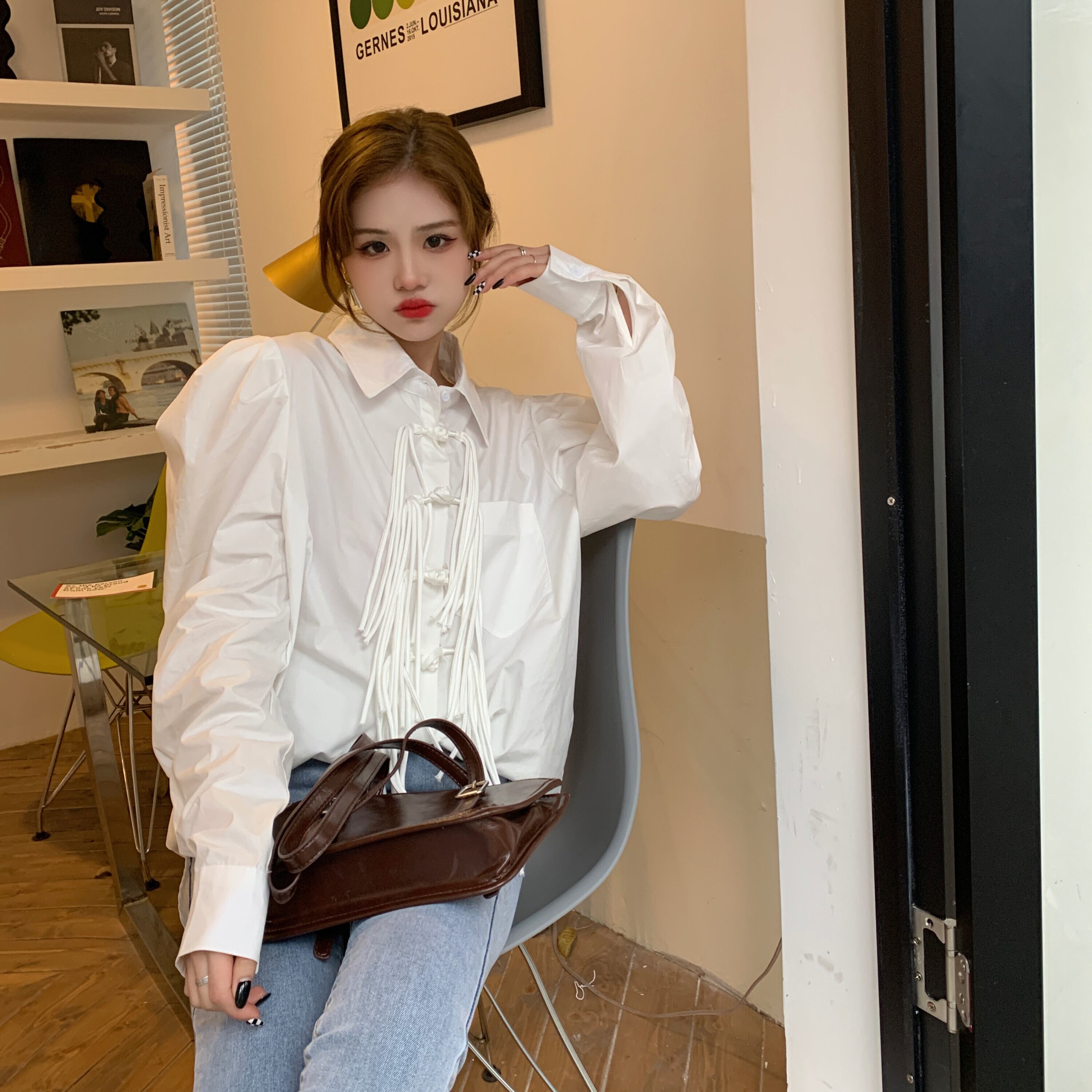 【送料無料】2色 ロング シャツ ブラウス パフスリーブ フリンジ 大人可愛い 個性的 長袖 トップス レディース 襟付き 無地 きれいめ 可愛い フリル かっこいい 大きいサイズ XL 2XL 3XL 4XL ホワイト グリーン 白 緑 春 夏 映える 萌袖 存在感 カワイイ おしゃれ デート お出かけ こなれ感 抜け感 女子会 普段 デイリー 休日 主役級 インスタ映え 韓国ファッション 海外 トレンド シャツコーデ クール モード系 10代 20代 30代 プチプラ db2531