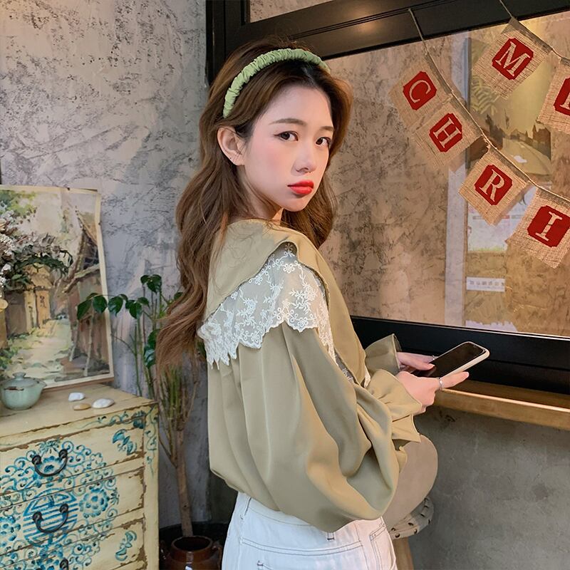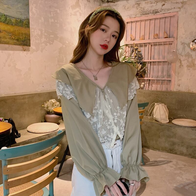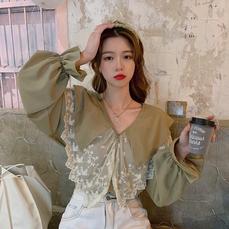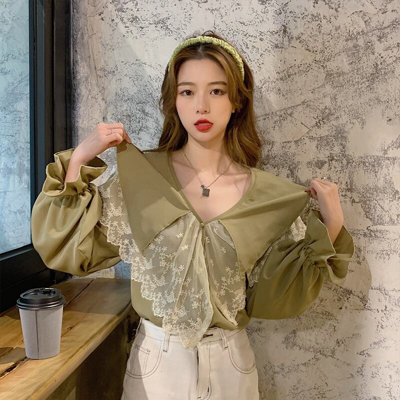 【送料無料】ブラウス シャツ Vネック ビッグカラー レース フリル 大人可愛い ガーリー レトロ バイカラー くすみカラー 長袖 春 秋 トップス きれいめ キュート 大きいサイズ XL 2XL 3XL 4XL グリーン 緑 春 夏 カワイイ おしゃれ デート お出かけ 存在感 こなれ感 抜け感 女子会 普段 デイリー 休日 主役級 韓国 オルチャン ファッション コーデ モテ ラブリー フェミニン 女の子 トップス 10代 20代 30代 プチプラ db2532
