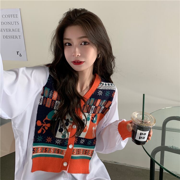 【送料無料】シャツ ブラウス ニット Vネック 個性的 プリント 大人可愛い 長袖 白 トップス レディース 大きいサイズ XL 2XL 3XL 4XL グリーン オレンジ 緑 春 夏 きれいめ キュート 可愛い インスタ映え コーデ カーディガン風 レトロ カワイイ おしゃれ デート お出かけ 存在感 こなれ感 抜け感 女子会 普段使い デイリー使い 休日 主役級 インスタグラマー インスタ映え 韓国ファッション オルチャン 海外 大人気 高見え トレンド 10代 20代 30代 プチプラ db2533