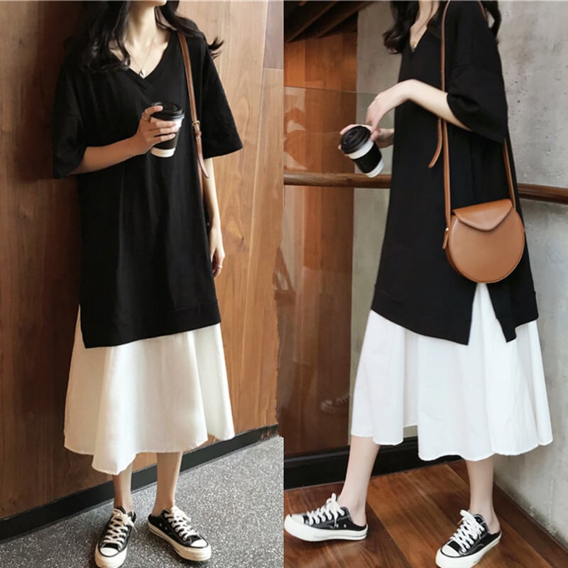 【送料無料】ワンピース ミモレ丈 半袖 重ね着風 フェイク ワンピ ドッキング 黒 無地 レディース ルーズ Vネック ルーズ プルオーバー 夏 バイカラー ブラック 黒 無地 大きいサイズ L XL 2XL 3XL 4XL シンプル カジュアル おしゃれ 大人可愛い こなれ感 大人女子 かわいい お洒落 大人カジュアル ゆったり ゆる 10代 20代 30代 40代 休日 お出かけ デート 女子会 普段使い 普段着 楽ちん プチプラ モテコーデ 着回し 韓国系 ファッション db2375