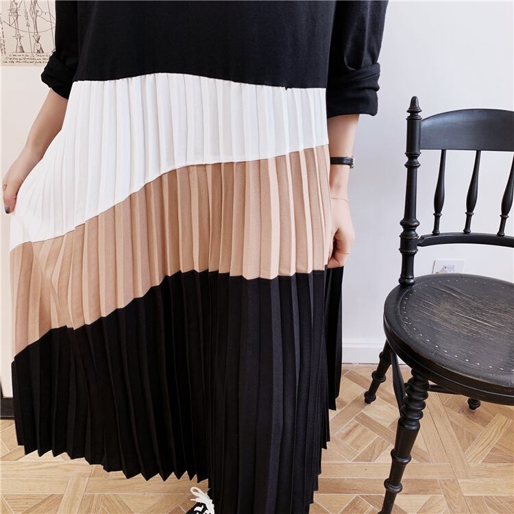 【送料無料】ロング ワンピース プリーツ バイカラー 個性的 ワンピ 長袖 ラウンドネック プルオーバー 春 秋 ブラック 黒 袖あり おしゃれ カジュアル ゆったり 楽ちん 部屋着 大きいサイズ L XL 2XL 3XL シンプル カジュアル レトロ 大人可愛い おしゃれ こなれ感 お洒落 大人カジュアル ゆったり かわいい 10代 20代 30代 40代 普段使い 休日 女子会 お出かけ デート お散歩 モテコーデ 着回し 韓国系 インスタ映え ファッション 楽ちん db2376