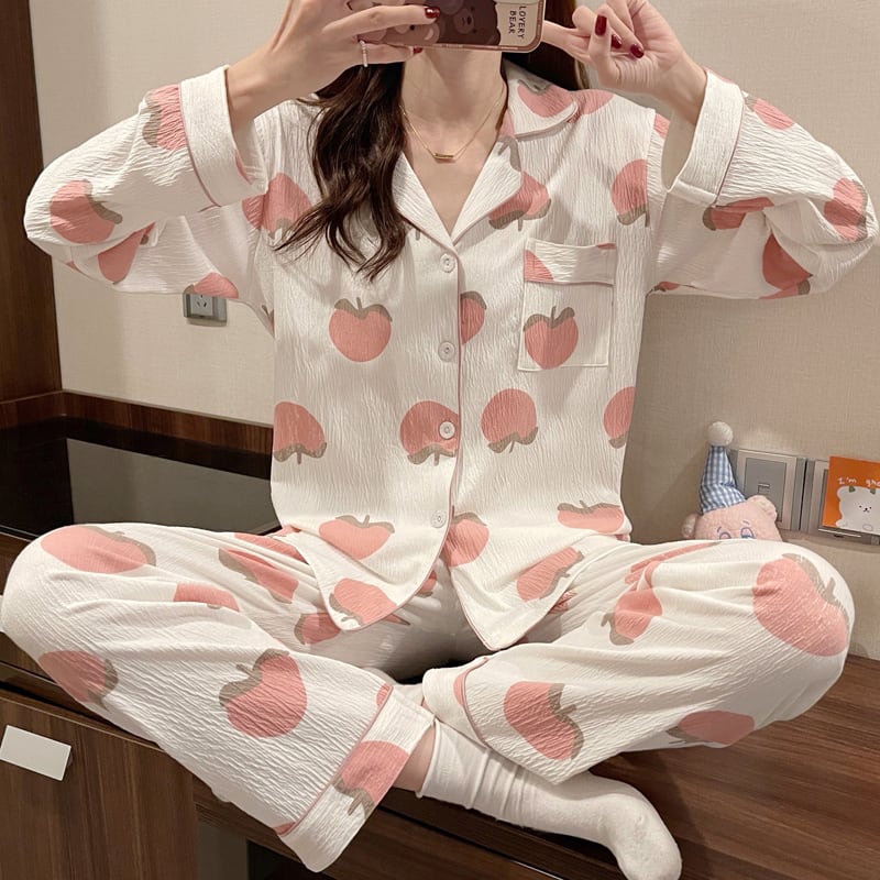 【送料無料】2色 パジャマ ルームウェア 長袖 上下セット 柿 くま 柄 白 可愛い 個性的 レディース 部屋着 ナイトウエア 寝間着 ツーピース プリント 熊 ボタン ホワイト 襟付き ポケット おしゃれ かわいい ラブリー 大きいサイズ M L XL 2XL 可愛い 個性的 インスタ映え ファッション カジュアル コーデ デート お泊り 女子会 お揃い 双子 旅行 主役級 10代 20代 春 秋 冬 トレンド 抜け感 オシャレ ゆったり らくちん ルーズ ゆる キュート db2811