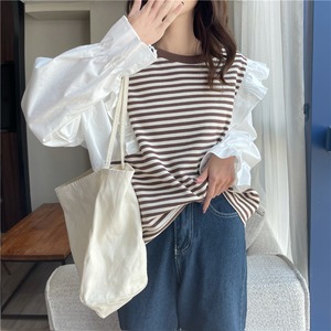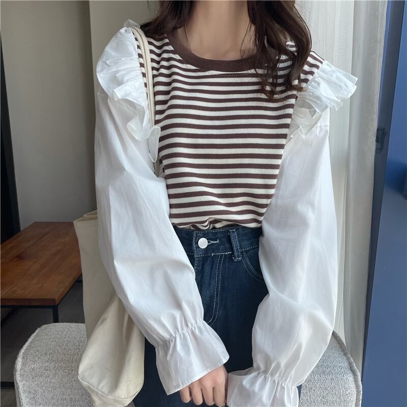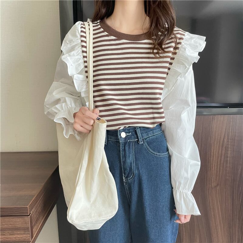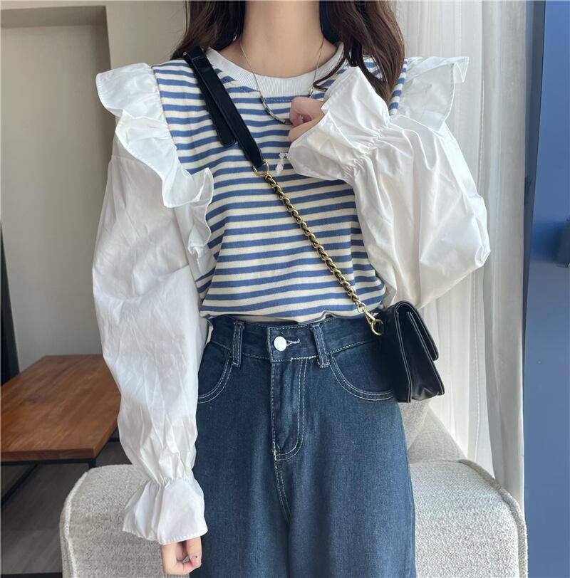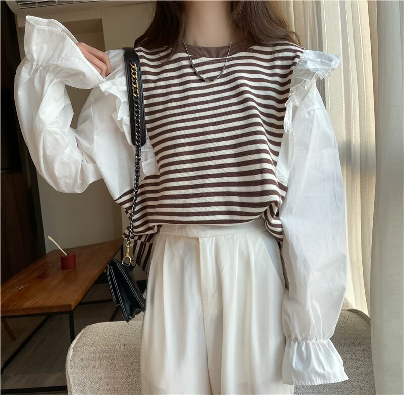 【送料無料】2色 白 シャツ ブラウス レディース 長袖 トップス フリル ボーダー 切り替え かわいい カジュアル お洒落 個性的 ラウンドネック ストライプ ドッキング 春 トップス 秋 袖あり 萌袖 こなれ感 ラフ キュート ガーリー 主役級 存在感 ブルー ブラウン ストライプ 10代 20代 学生 通学 デート お出かけ 女子会 休日 旅行 着回し 普段使い お揃い 双子 韓国系 ファッション モテ プチプラ 安い 流行 インスタ映え 白コーデ ラブリー ガーリー 他にない db2736