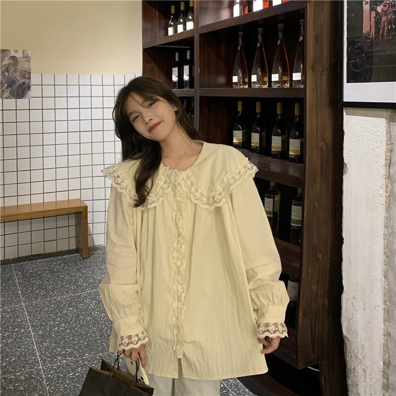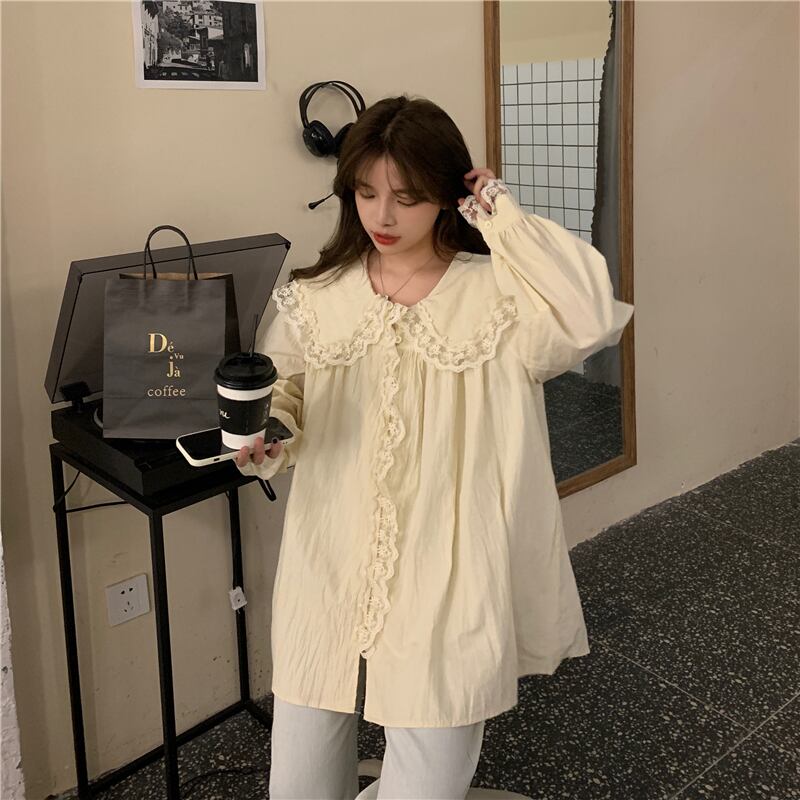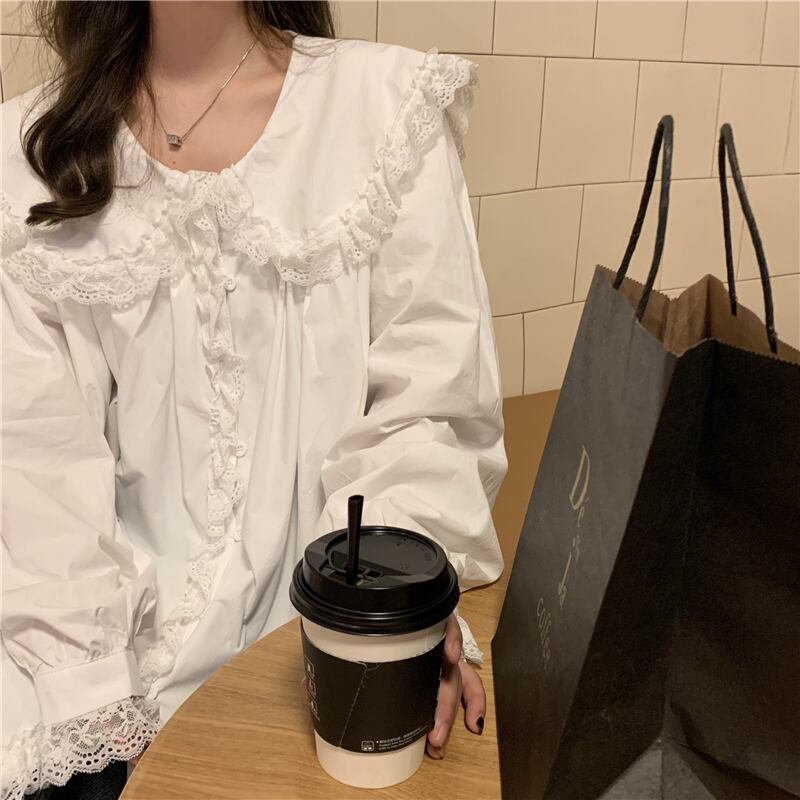 【送料無料】2色 白 シャツ ブラウス ロング丈 レディース 長袖 ビッグカラー フリル レース 萌袖 かわいい ラブリー 大きめ ゆったり 春 夏 トップス 薄手 襟付き おしゃれ お洒落 レトロ 大人可愛い ラフ 個性的 韓国 ファッション ロングシャツ 前開き 主役級 存在感 ワンサイズ ホワイト ベージュ 10代 20代 女の子 学生 通学 デート お出かけ 女子会 休日 着回し 普段使い 重ね着 お揃い 双子 オルチャン モテ コーデ ホワイト ラブリー ガール フェミニン db2753