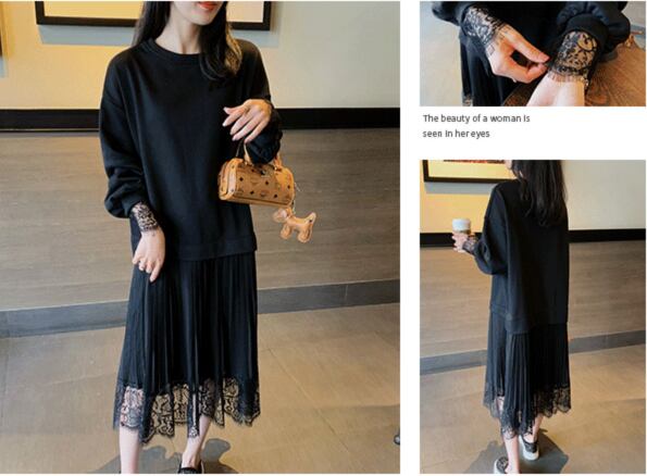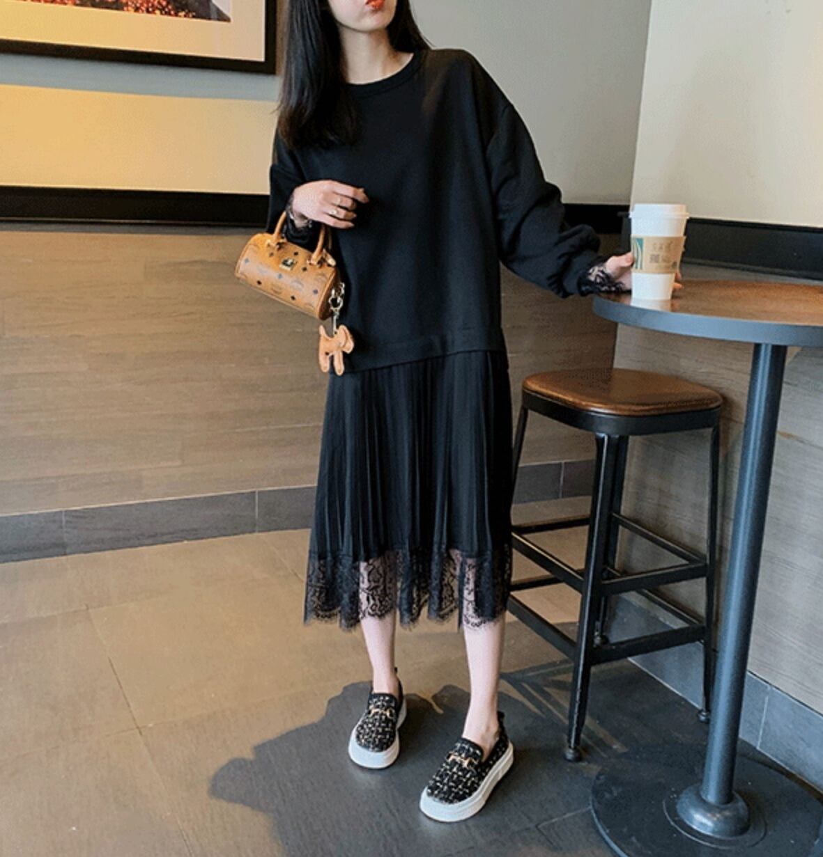 【送料無料】ドッキング ワンピース レディース ミモレ丈 ロング丈 黒 長袖 ラウンドネック レース プリーツ スカート 春 秋 ボトムス ルーズ 大人可愛い きれいめ シンプル カジュアル 大人女子 こなれ感 主役級 存在感 S M L XL 2XL 3XL 大きいサイズ 黒 ブラック コーデ 無地 ラウンドネック 袖あり ワンピ ドレス 10代 20代 30代 女の子 休日 パーティー 普段 オルチャン ファッション 楽ちん モテ 体系カバー 新作 トレンド 流行 インスタ映え db2755