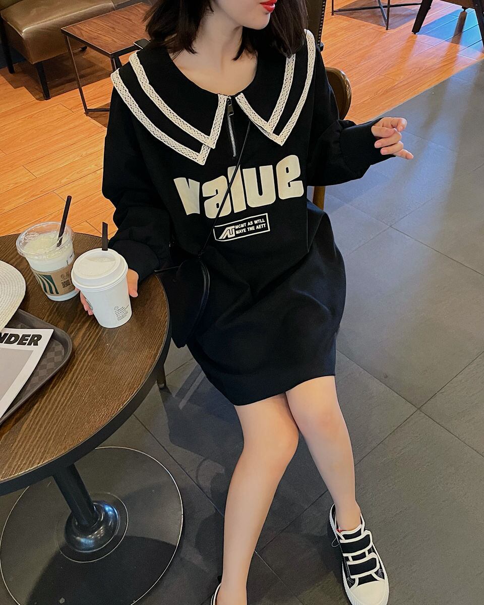 【送料無料】ひざ丈 ワンピース レディース 黒 ビッグカラー おしゃれ 大人可愛い 英文字 ロゴ 個性的 ワンピ ドレス 膝 ミドル丈 長袖 ルーズ ダブルカラー 襟 かわいい シンプル カジュアル こなれ感 主役級 存在感 M L XL 2XL 3XL 大きいサイズ ブラックコーデ 無地 2022 春 秋 10代 20代 30代 女の子 通勤 学生 通学 デート お出かけ デイリー 普段使い 韓国 韓国系 ファッション 楽ちん ゆったり 体型カバー ママ ユニーク ボトムス db2757