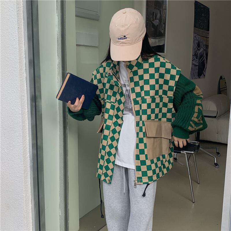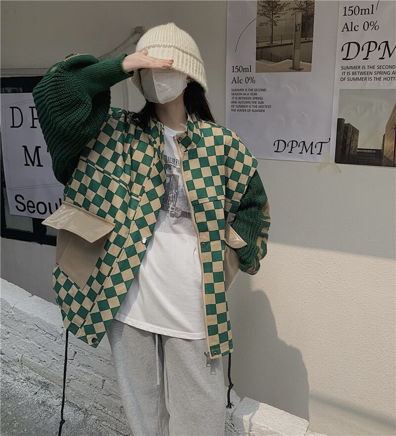 【送料無料】ジャケット コート ショート丈 レディース 異素材ミックス ブロックチェック 緑 グリーン リブニット 個性的 アウター ジャンパー 女の子 切り替え かっこいい メンズライク ボリュームスリーブ バイカラー ロゴ スタンドカラー ポケット 秋 冬 10代 20代 レディース ママ OL 学生 デート お出かけ 普段使い 重ね着 暖かい 防寒 インスタ映え フリーサイズ ゆったり カジュアル お洒落 かっこいい レトロ ラフ ボーイッシュ プチプラ 個性的 主役級 存在感 韓国 db2768